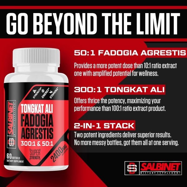 OPTIMIZED DOSAGE & ABSORPTION: Experience the full benefits* of Fadogia Agrestis and Tongkat Ali in one powerful formula. Salbinet highly concentrated blend delivers the perfect dosage of both ingredients to provide maximum strength ,muscle mass and improved* absorption for optimal results.