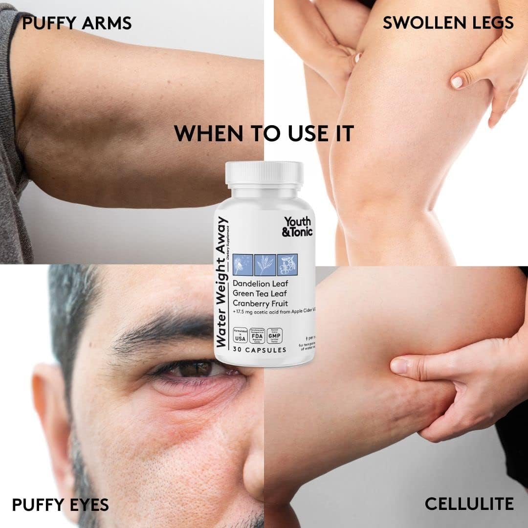 Water Weight Away 30 pills for temporary water gain and swelling | For excess water retention in legs feet arms ankles or for puffy eyes & swollen face | With ACV, green tea, dandelion & potassium and other ingredients with a diuretic effect