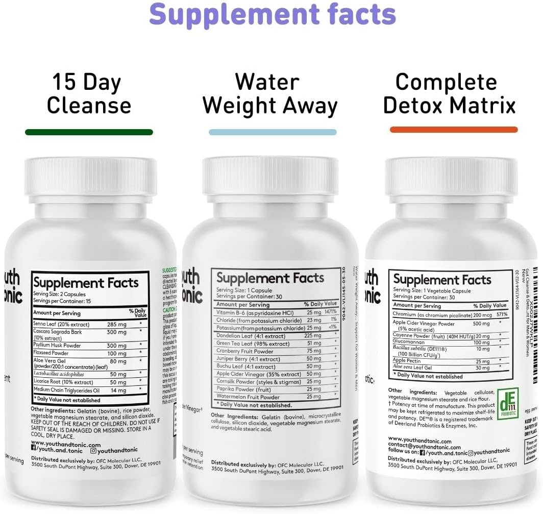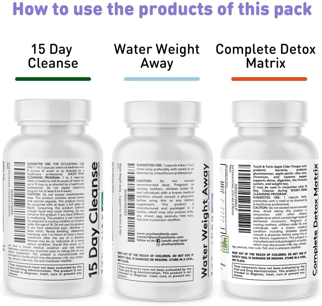 Do not exceed recommended dosage. 15 Day Cleanse contains senna leaves and cascara sagrada. This product should be consumed with at least a full glass of liquid. Consuming this product without enough liquid may cause choking. Do not consume this product if you have difficulty in swallowing. If you have a known medical condition and are taking medication, consult your physician prior to taking this or any dietary supplement. This product is not intended for pregnant or nursing mothers or children under the age of 18. Avoid taking Complete Detox Matrix in conjunction with other dietary supplements which contain high levels of elemental chromium. Pregnant or nursing mothers, children under 18, and individuals with a known medical condition should consult a physician before using this or any dietary supplement. This product is manufactured and packaged in a facility which may also process milk, soy, wheat, egg, peanuts, tree nuts, fish and crustacean shellfish. KEEP OUT OF THE REACH OF CHILDREN. DO NOT USE IF SAFETY SEAL IS DAMAGED OR MISSING. STORE IN A COOL, DRY PLACE.