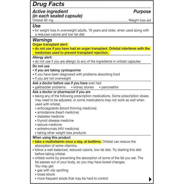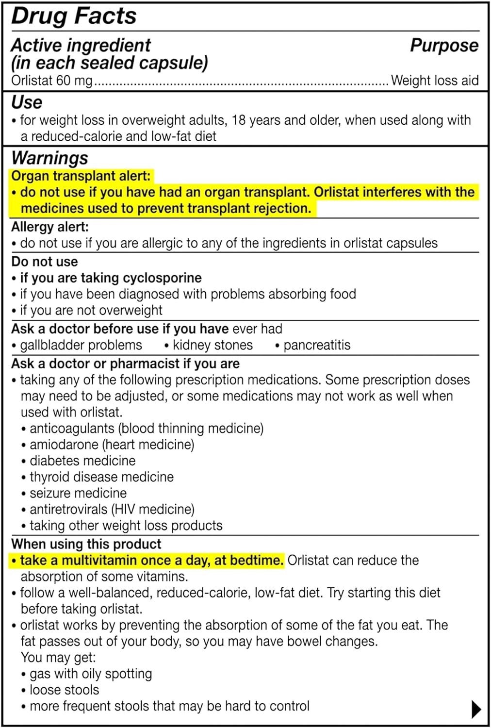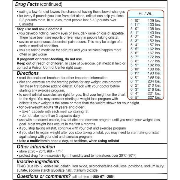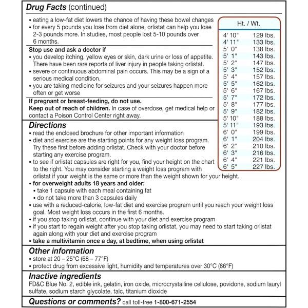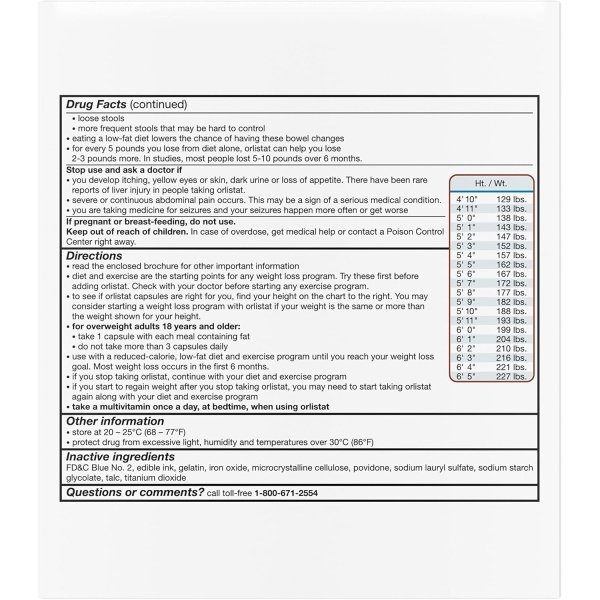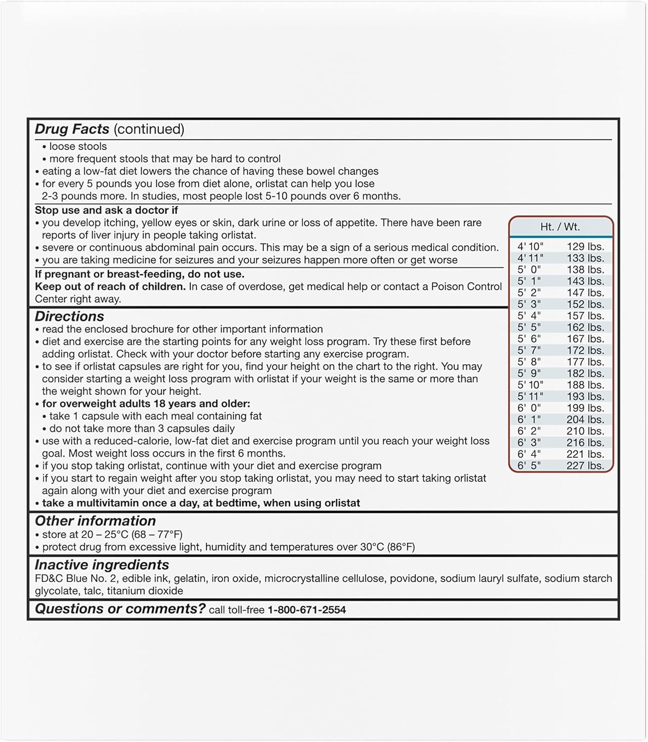 alli (orlistat 60 milligram capsules) is your smart edge for weight loss. Among weight loss products, it’s the only FDA-approved over-the-counter weight loss aid. Orlistat, the active ingredient in alli, is a lipase inhibitor and works by binding to specific enzymes that break down fats. As a result, about 25 percent of the fat you consume is not absorbed and passes through the digestive system. Since the calories associated with this unabsorbed fat are not used, the number of calories that enter your system is reduced. You’re ready with alli by your side. alli (orlistat 60 milligram capsules) is a weight loss aid for overweight adults, 18 years and older, when used along with a reduced-calorie and low-fat diet. Read and follow label directions. alli orlistat 60 mg capsules weight loss pill refill pack (170 capsules) contains: A read me first brochure and up to 40-day supply. It is designed for people who are already using alli and have previously purchased the starter pack. Helps you lose more weight than dieting alone. Read the enclosed brochure for other important information. Diet and exercise are the starting points for any weight loss program.