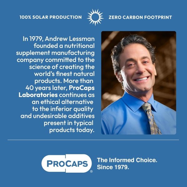 ETHICAL & ECO-FRIENDLY. ZERO CARBON FOOTPRINT – Uniquely committed to your health and the health of the planet, ProCaps’ facilities are 100% Solar Powered with a Zero Carbon Footprint and an LEED GOLD green building status. ALL ProCaps bottles are made from 100% recyclable post-consumer resin. Plus, Andrew Lessman and ProCaps are the largest donor of prenatal vitamins in the world (over 1.5 billion capsules donated to date). ProCaps, the Informed Choice for Nutritional Supplements.