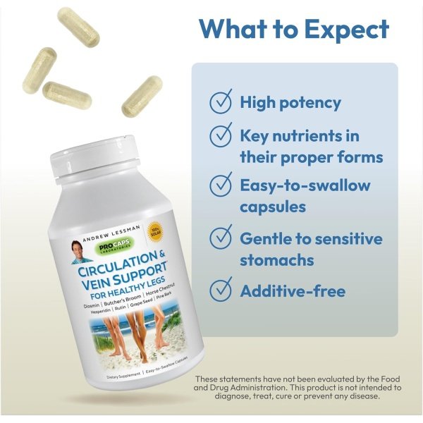 Andrew Lessman’s Circulation and Vein Support is a blend of the most effective, clinically studied natural ingredients to promote healthy circulation in the legs and provide relief to their challenged tissues and veins. This unique formula is designed to combat the natural swelling of the veins and tissues of our legs that occur with aging, overweight and our daily activities. The blood vessels in our legs are perhaps the most challenged in our body and, as a result, our feet, ankles and calves can swell, enlarge and experience discomfort. This normal process is intensified by aging, overweight and prolonged sitting or standing. Our primary ingredient, Diosmin is the most researched natural ingredient for promoting healthy leg circulation. It has been recommended by physicians in Europe for over 70 years for swollen, heavy, uncomfortable legs, as well as to promote the healthy function and appearance of leg veins. We also add extracts of both Butcher’s Broom and Horse Chestnut – two natural ingredients utilized traditionally for centuries in Europe. Both ingredients have been clinically shown to relieve tired, heavy legs and promote optimum leg vein health and appearance. We also add the protective benefits of Hesperidin, Rutin, Pine Bark and Grape Seed. In short, Circulation and Vein Support is designed to provide a visible, tangible difference to the circulation, tissues and veins of our legs. Its unique proprietary blend of Diosmin, Butcher’s Broom and Horse Chestnut extract provide a natural, clinically validated response to the enormous demands we place on the already challenged circulation in our legs.The best circulation products are those with proven results, and that work with your body’s natural systems to make a difference from within.Not just a varicose veins treatment for legs – our formula can also be helpful for those suffering with spider veins, swelling, and numbness.