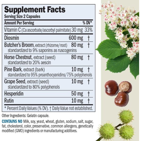 SUPERIOR Pure BIO-ACTIVE INGREDIENTS – Comprehensive blend of Diosmin, Hesperidin, Rutin, Butcher’s Broom extract, Pine Bark extract, Horse Chestnut extract, Grape Seed extract and Vitamin C. Unlike creams, our formula works from the inside-out. Dairy-Free, Gluten Free; NO soy, yeast, wheat, sodium, salt, sugar, starch, fat, cholesterol, oil, wax, binder, filler, excipient, lubricant, coating, diluent, flowing agent, common allergens, color, flavor, sweetener or preservative..