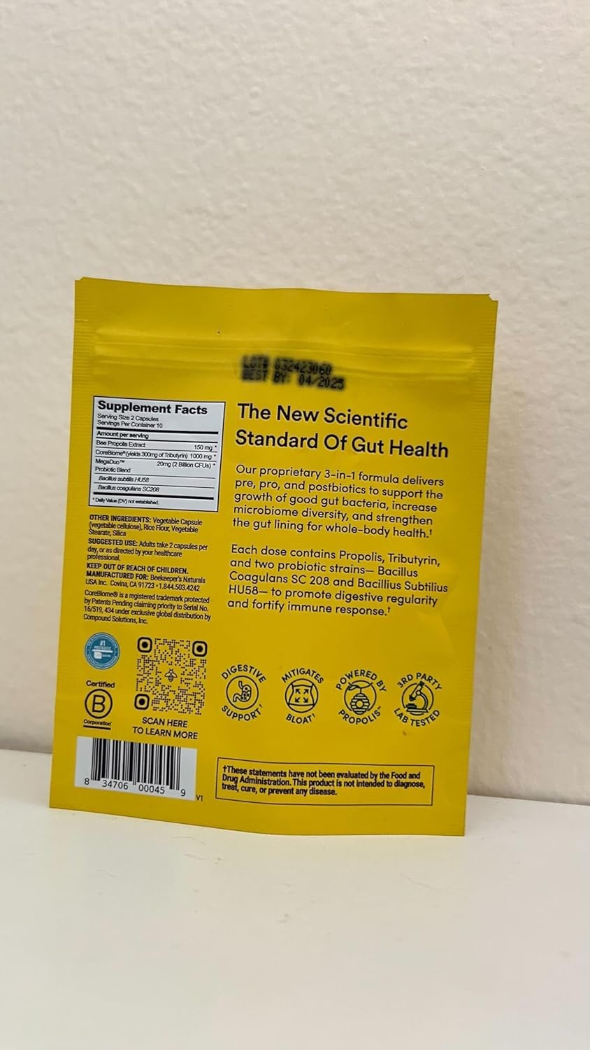 Complete Gut Health 3 in 1: Complete Gut Health regulates and supports overall digestive balance with a powerful blend of prebiotic propolis, probiotic megaduo, and postbiotic corebiome; Our triple threat of ingredients promotes a healthy gut microbiome, supports brain and immune function, and helps regulate the proper functions that naturally occur in the gut.