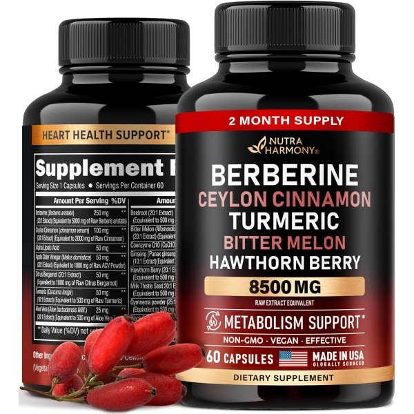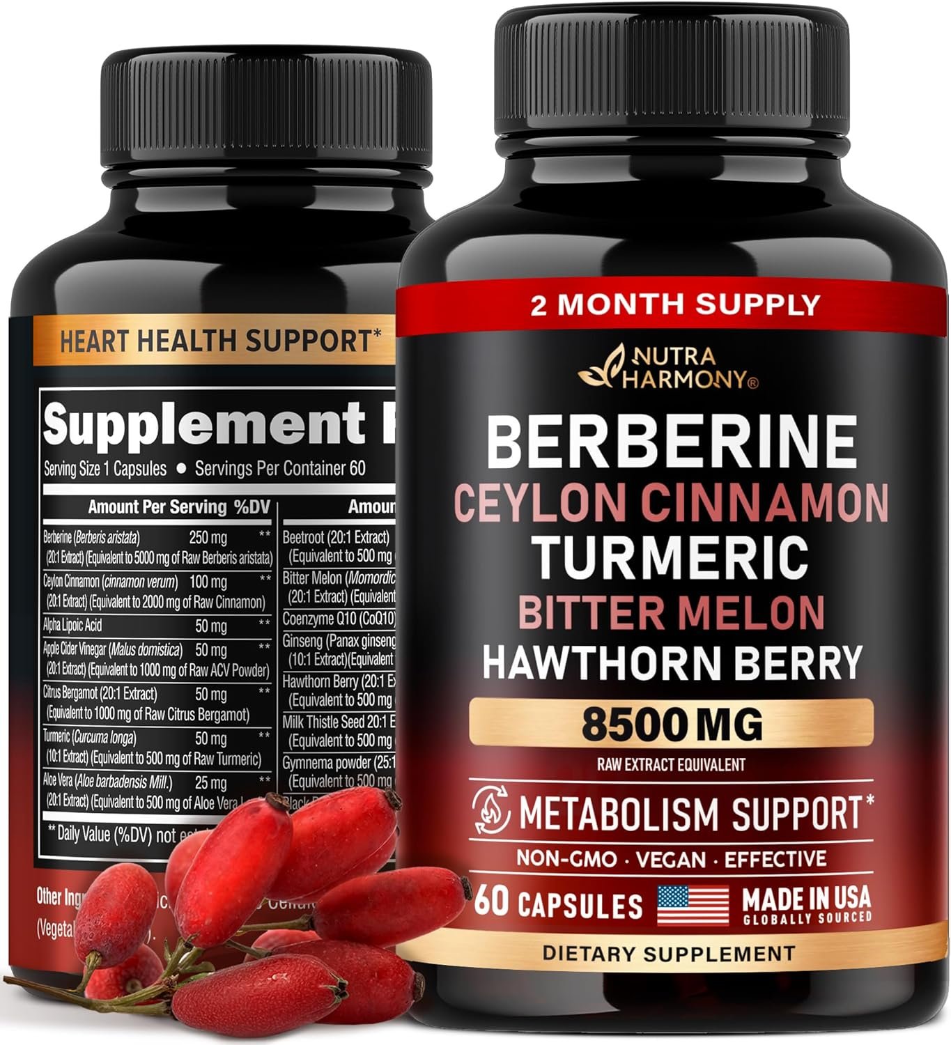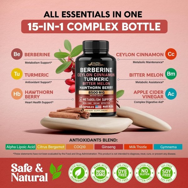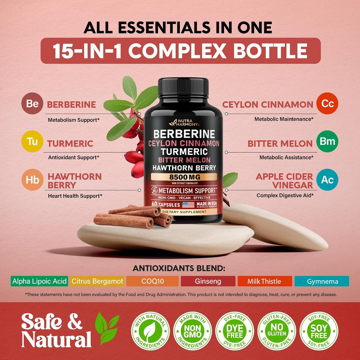 15-in-1 Heart Support Blend — Our Berberine Blend Capsules pack a powerful punch with 15 potent ingredients, including Berberine, Ceylon Cinnamon, Citrus Bergamot, Apple Cider Vinegar (ACV), CoQ10, Alpha Lipoic Acid (ALA), Hawthorn Berry, and more for comprehensive health support.