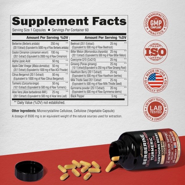 Made in USA — Rest assured! Berberine supplement is proudly manufactured in the USA under strict quality control standards, Third Party Tested & GMP certified. We adhere to rigorous procedures to ensure every batch’s safety, purity, and efficacy. We use the most potent forms of each component to achieve maximum effect. Highest quality & purity to ensure the best results!