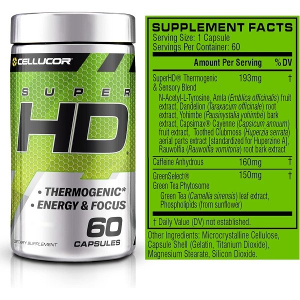 Super HD is the high-definition thermogenic formulated to ramp up your body support results. Fire Up Your Metabolism Powered by the high-definition formula of clinically studied ingredients, Super HD fires up your body support journey with EXPLOSIVE ENERGY Ignite your calorie torching journey with explosive energy from 160mg of caffeine. THERMOGENIC FORMULA Formulated with the legendary metabolism-boosting, body support combination of Caps Imax Cayenne and Green select Green Tea extract. MENTAL FOCUS — Laser in your focus with the cognitive support of nootropic ingredients Huperzine A and N-Acetyl-L-Tyrosine. TONED PHYSIQUE — Shed the excess water to look and feel your best. Quality You Can Trust With 20 years of sports nutrition expertise, Super HD is backed by quality you can trust to deliver results. High-Definition Thermogenic Formula Super HD delivers body support results through its legendary high-definition formula. Capsimax Cayenne — the metabolism ingredient to fire up your metabolism Green select Green Tea Extract — clinically shown to support body support Amla Fruit Extract — also known as Indian Gooseberry, contains active compounds to support mental energy and memory. Toothed Clubmoss — a natural source of Huperzine A, an active compound that may help with memory and concentration.