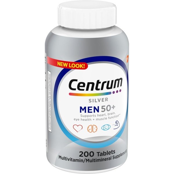 One 200 count bottle of Centrum Silver Multivitamin for Men 50 Plus, Multivitamin/Multimineral Supplement with Vitamin D3, B-Vitamins and Zinc
