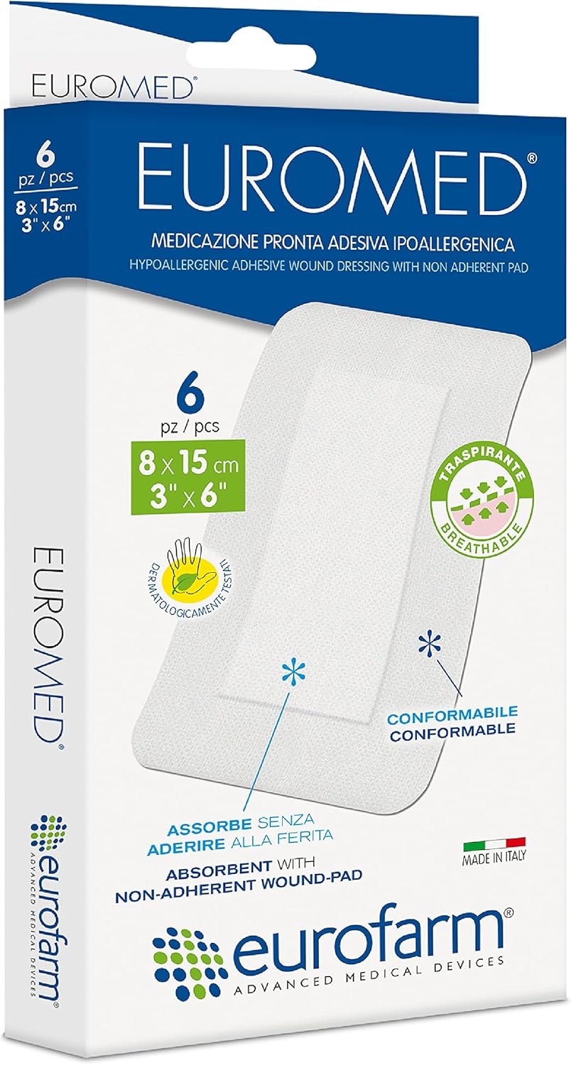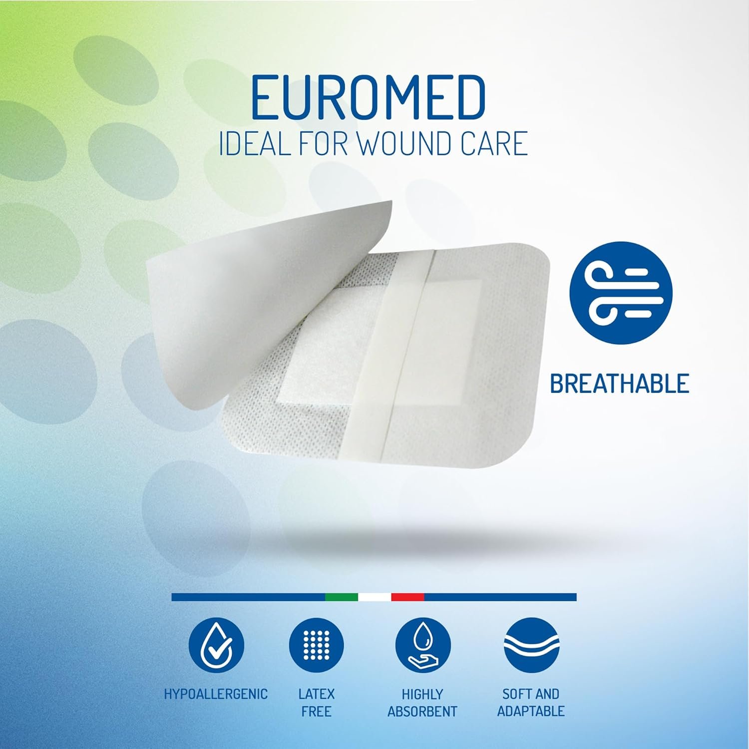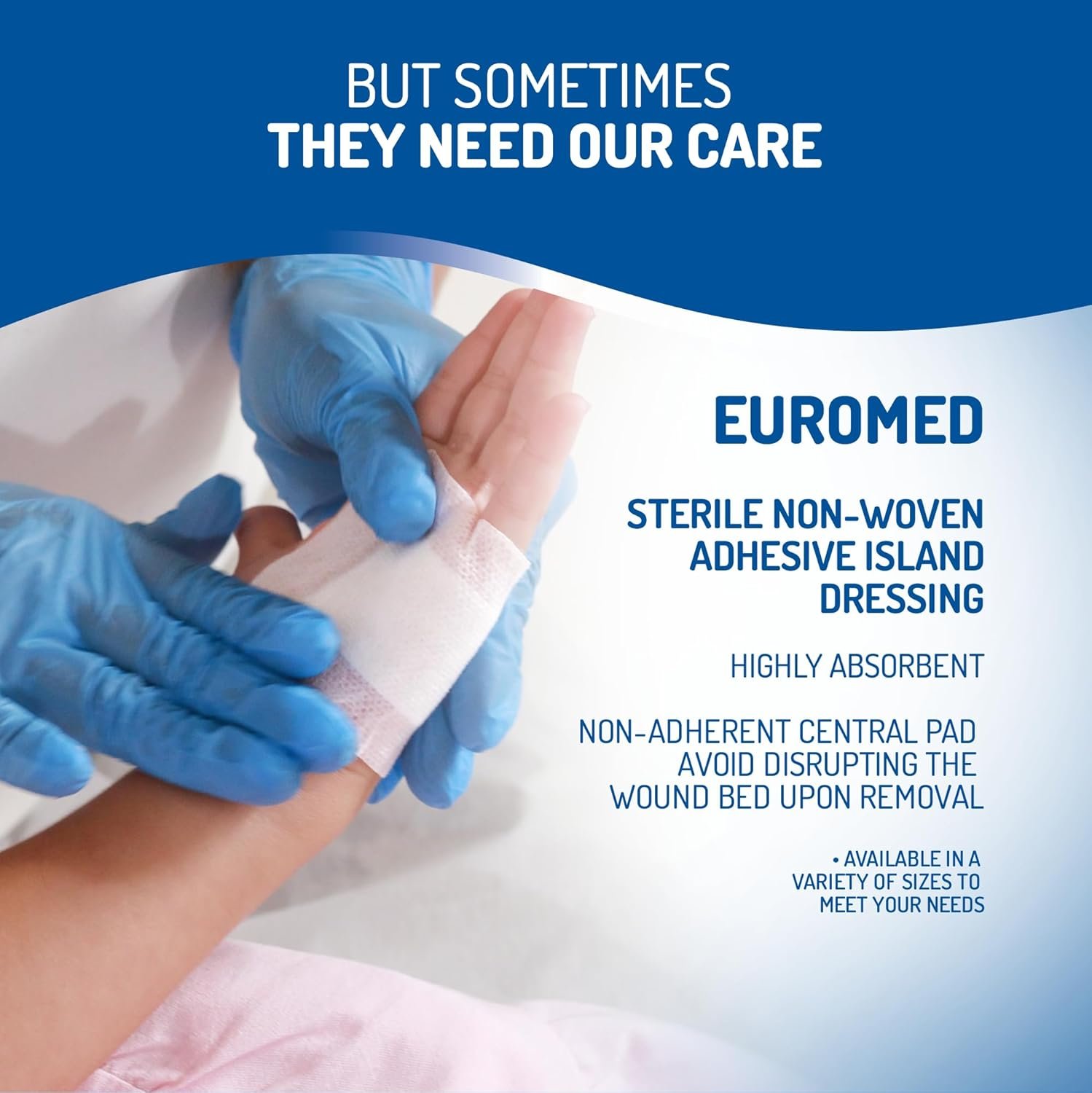 NON-ADHERENT WOUND CONTACT LAYER – The PE wound contact layer enables the passage of blood and exudates into the absorbent pad while maintaining a good healing environment and minimal pain upon dressing removal. Euromed is latex free.