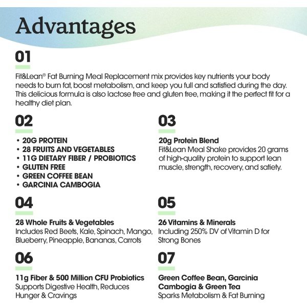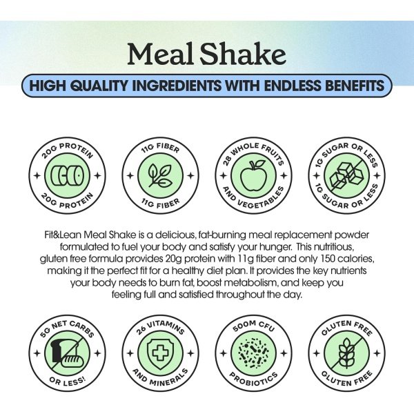 WHAT IS FIT & LEAN FAT BURNING MEAL REPLACEMENT? Fit & Lean Fat Burning Meal Replacement is a guilt free and delicious meal replacement powder that will satisfy your cravings and hunger. This delicious formula is gluten free, making it the perfect fit for a healthy diet plan. WHAT DOES FIT & LEAN FAT BURNING MEAL REPLACEMENT DO? It works by providing the key nutrients your body needs to burn fat, boost metabolism, and keep you full and satisfied during the day. WHAT MAKES FIT & LEAN FAT BURNING MEAL REPLACEMENT BETTER THAN OTHER SHAKES? The key to a successful diet is sticking to your diet. Fit & Lean fat burning meal replacement will help you do this by keeping you full and satisfied, satisfying your cravings, and boosting your metabolism during the day.