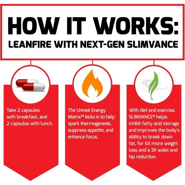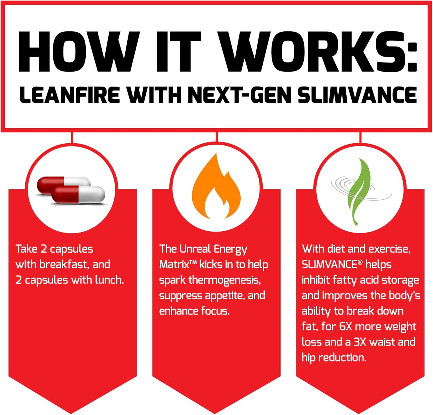 TRUE WEIGHT LOSS BREAKTHROUGH: For years, diet pills have notoriously produced mixed results, casting doubt on their effectiveness entirely. After nearly 30 years of mediocre formulas, the next generation in weight-loss science has arrived. LeanFire with Next-Gen SLIMVANCE is engineered to deliver comprehensive weight loss results in three phases: restrict fat production, prevent fat storage, and ignite fat oxidation.