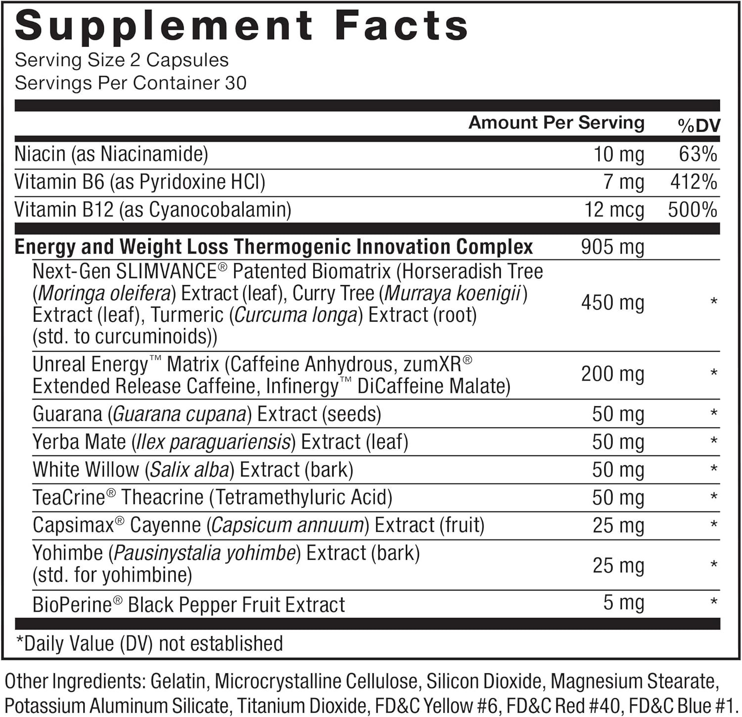 This powerful formula contains a total of 6 premium branded ingredients, including 4 specifically targeted to help increase thermogenic energy. The propriety Unreal Energy Matrix features Infinergy and extended release zümXR for an ongoing boost throughout the day. TeaCrine provides a non-stim lift of focused, lasting energy to help you dial in to even the toughest tasks, while simultaneously working to improve mood, mental clarity, motivation, and more. Rounding out the formula are several additional metabolic boosters like yohimbine and Capsimax, plus BioPerine to help improve the absorption of key ingredients.