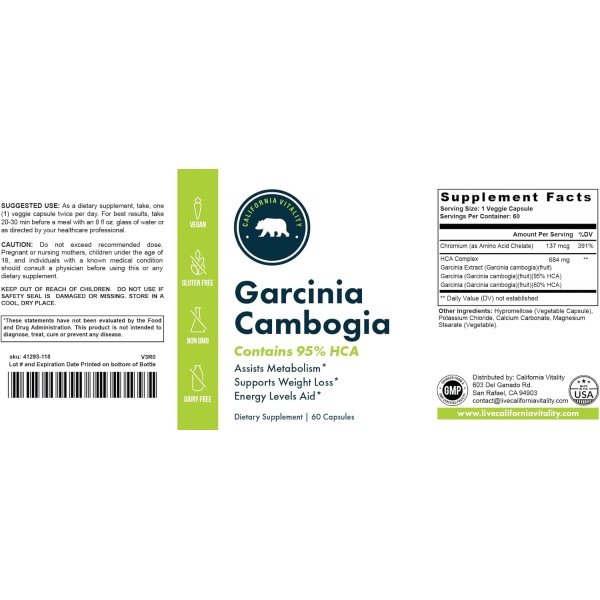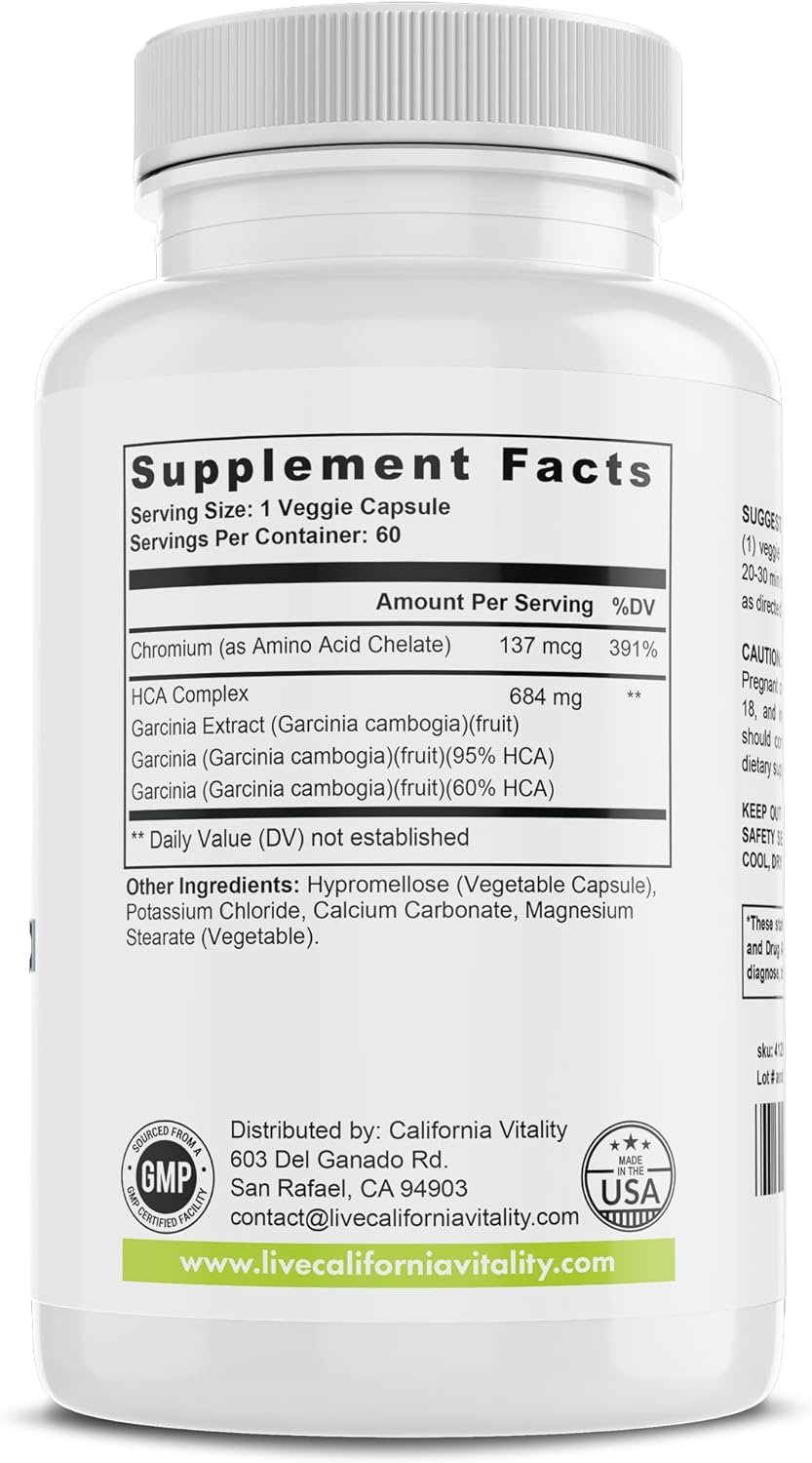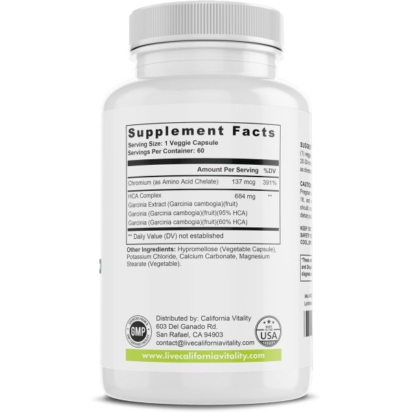California Vitality Garcinia Cambogia: Each bottle contains 60 capsules with a potent 95% HCA complex derived from the Garcinia Cambogia fruit, enhanced with Chromium.