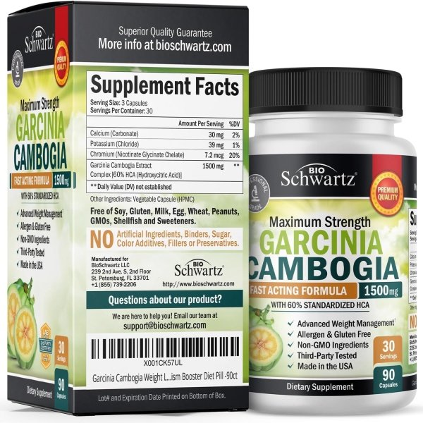 PREMIUM WEIGHT LOSS SUPPLEMENT TO HELP CURB APPETITE AND REDUCE BODY FAT*. BioSchwartz 60% HCA Pure Garcinia Cambogia formula for Weight Loss includes potassium chromium and calcium to help keep hunger in check by helping you feel fuller longer, and stimulates the use of stored body fat as energy by boosting your metabolic burn*!