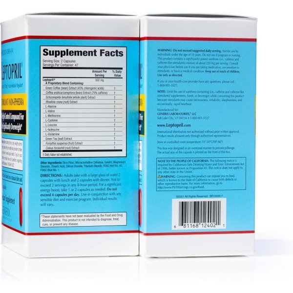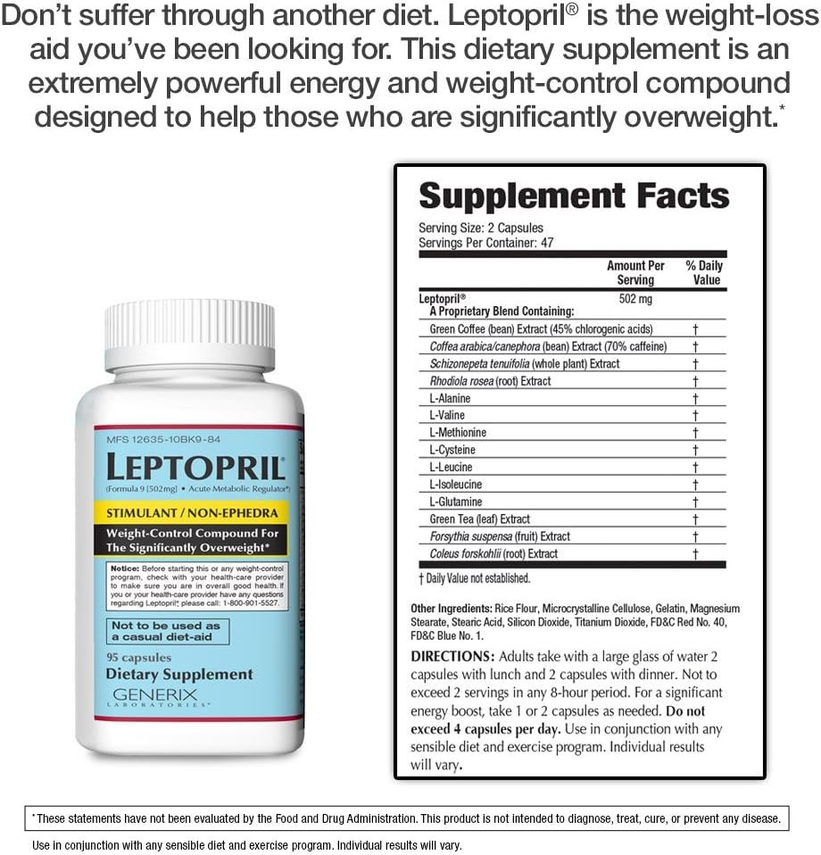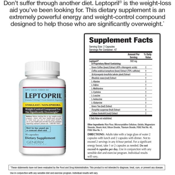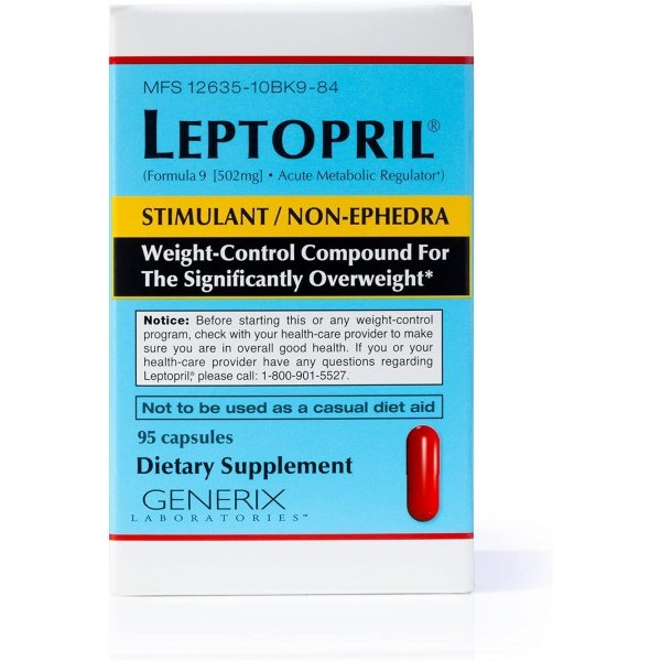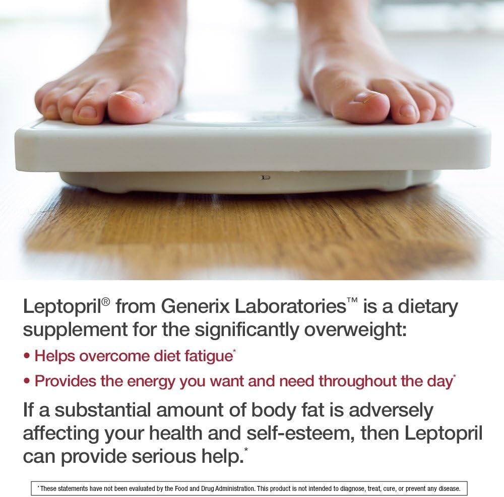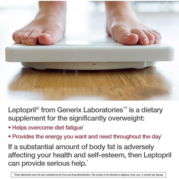 WHAT IS LEPTOPRIL? Leptopril is one of a new breed of energy and weight-control agents designed to target weight problems where they start (namely the two-hour period directly following the consumption of a meal). Leptopril is the first weight-control compound specifically designed for people who are significantly overweight. * In addition to its clinically tested weight-control compound, Leptopril contains powerful stimulants that help overcome diet fatigue and provide the energy you want and need throughout the day. * Leptopril is an extremely powerful weight-loss agent and is not intended for use by the casual dieter who is merely attempting to shed five or six “vanity” pounds. However, if significant, excess body fat is adversely affecting your health and self-esteem, then Leptopril can provide serious help. * Though everyone’s body is different and individual results will vary, participants in the clinical study of Leptopril’s key compound study lost about 11 pounds in 60 days. * WHAT DOES LEPTOPRIL DO? Leptopril is designed to help prevent fat formation at the earliest possible stage. In addition, Leptopril incorporates an extra but very important component for consumers trying to lose weight. Leptopril delivers a significant energy boost to meet daily energy demands and encourage thermogenesis. * IT WORKS GREAT! WHAT SETS LEPTOPRIL APART? Leptopril is a powerful stimulant-based weight-control compound intended for otherwise healthy people who are significantly overweight. * People who have hypertension, high blood pressure, diabetes, heart or prostate trouble, who are sensitive to stimulants, caffeine, stimulant-based supplements, or any other weight-loss compound should not take Leptopril. If you have any doubts about whether you should take Leptopril, consult your health-care professional.