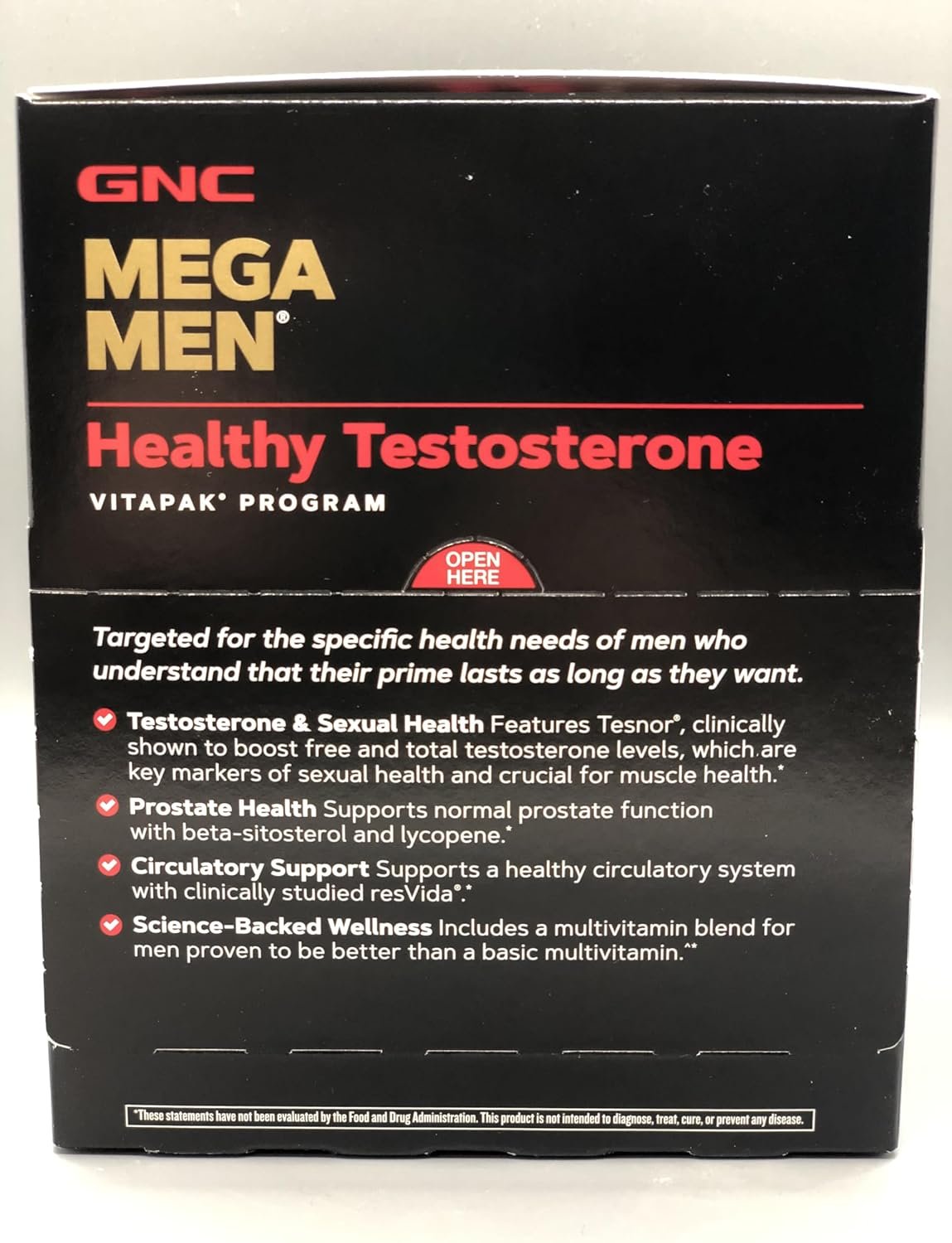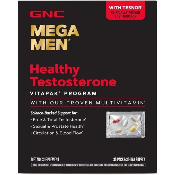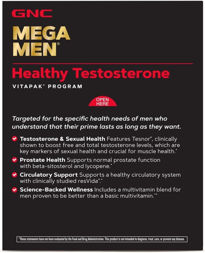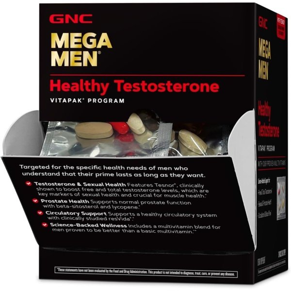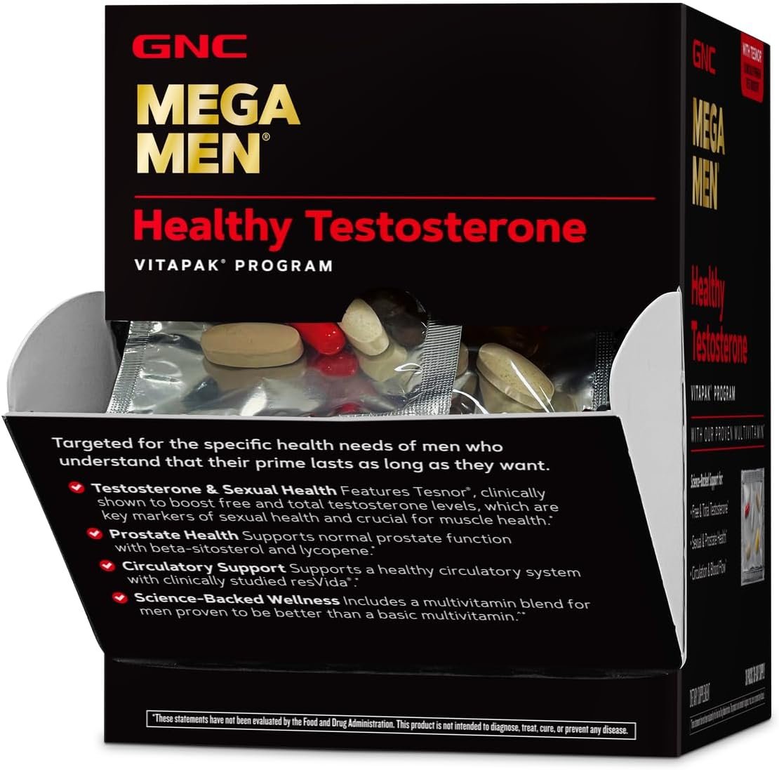 GNC’S BEST NUTRITION AND TESTOSTERONE SUPPORT: Get a clinically proven testosterone booster, a men’s multivitamin with immune support, and help for prostate and circulatory health in every GNC Mega Men Healthy Testosterone Vitapak Program. Save up to 40% compared to buying everything separately.