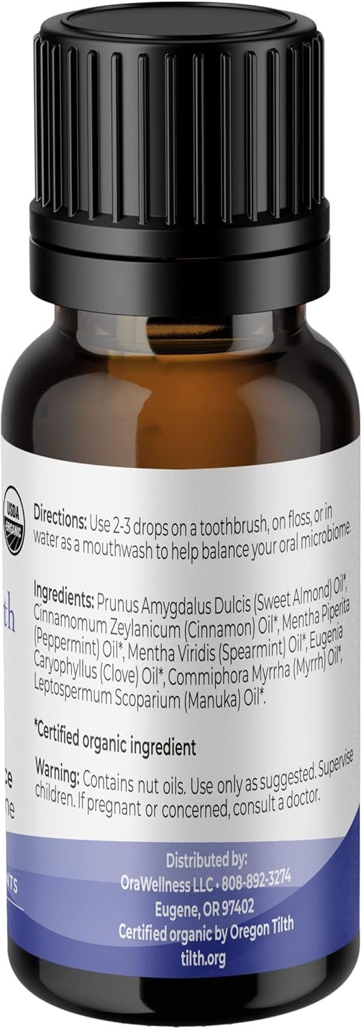 MADE FROM ORGANIC ESSENTIAL OILS of clove, myrrh, peppermint, cinnamon, spearmint and manuka, in a base of certified organic almond oil. Non toxic mouth wash is fluoride free, SLS free, Gluten free, Vegan friendly with organic ingredients. Safe for everyday use.