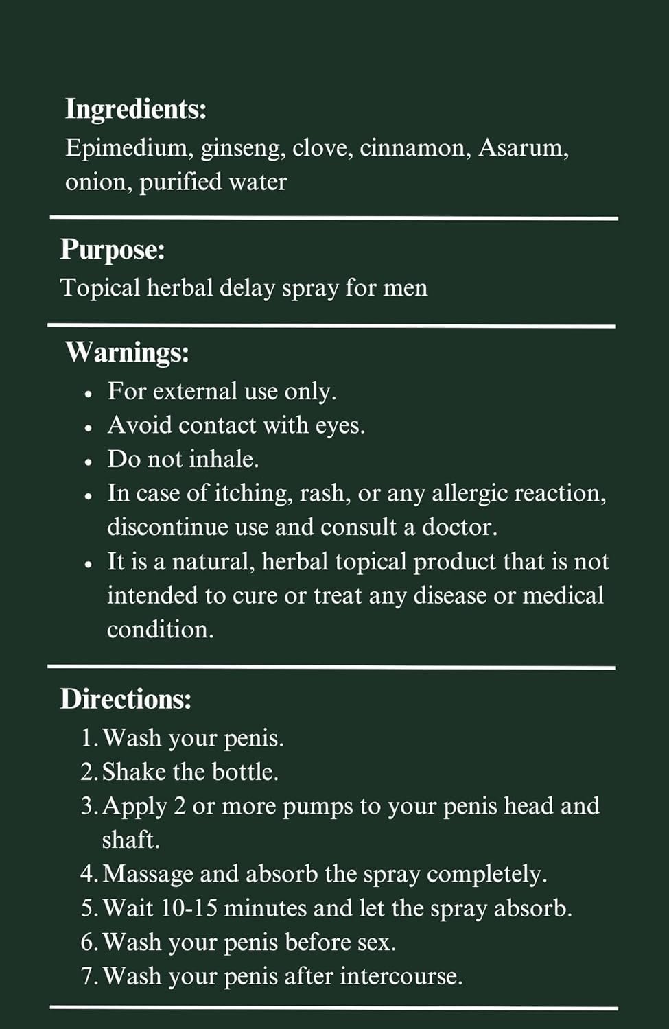 Herbal Delay Spray: No More PE Herbal Delay Spray is made from plant extracts and herbs. The formula is based on the ancient Chinese medicinal system. It contains Epimedium, ginseng, clove, cnidium, cinnamon, Asarum, onion, pulsatilla, and purified water.