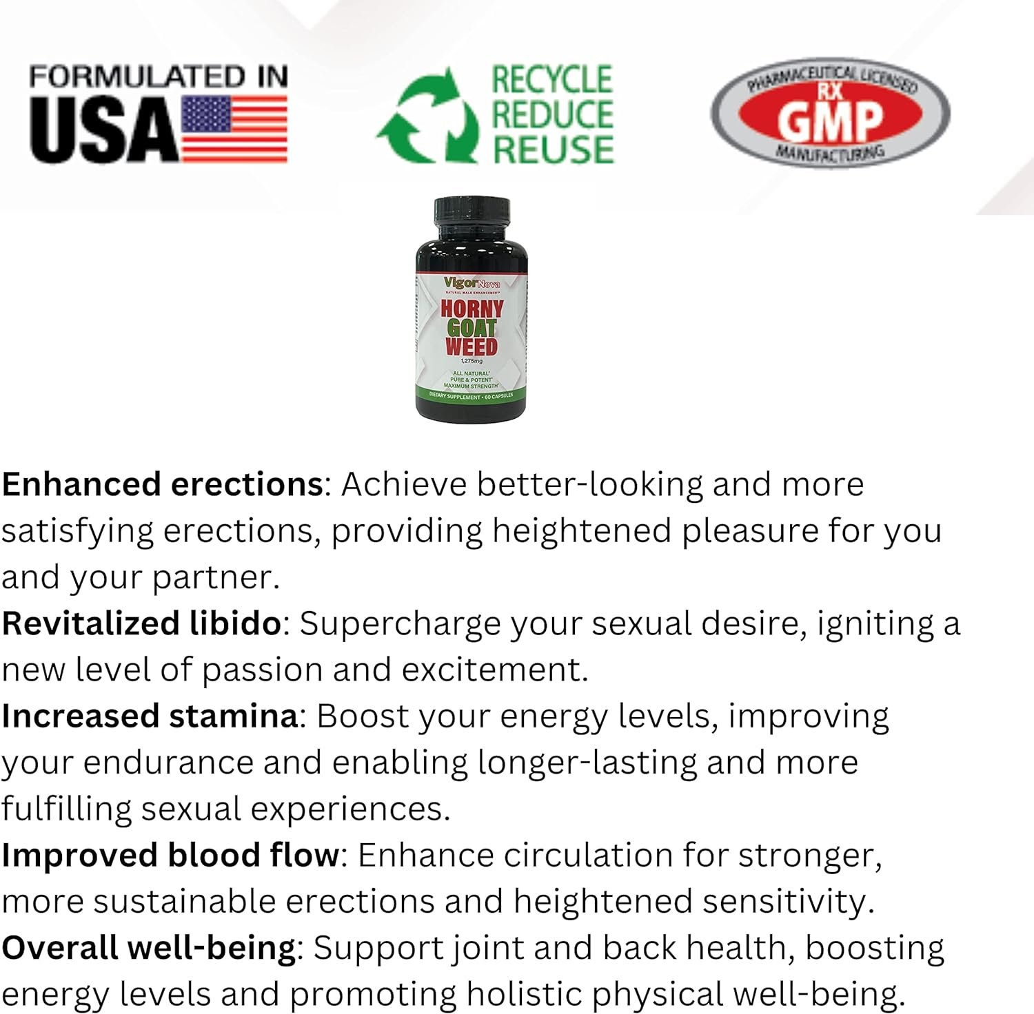 MADE IN THE USA & GMP CERTIFIED: VigorNova Horny Goat Weed is the ultimate male enhancement supplement, proudly made in the usa with the freshest and highest-quality ingredients. Our GMP certification ensures safety and effectiveness, and our natural male enhancement tonic is the best horny goat weed supplement for satisfying sex. No unnecessary additives or preservatives. For men who want to improve their sexual experience and overall well-being. Try it today!