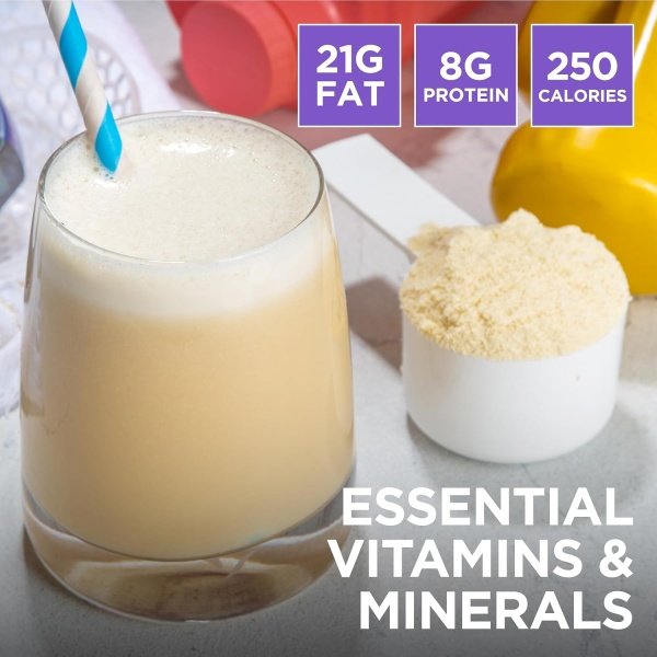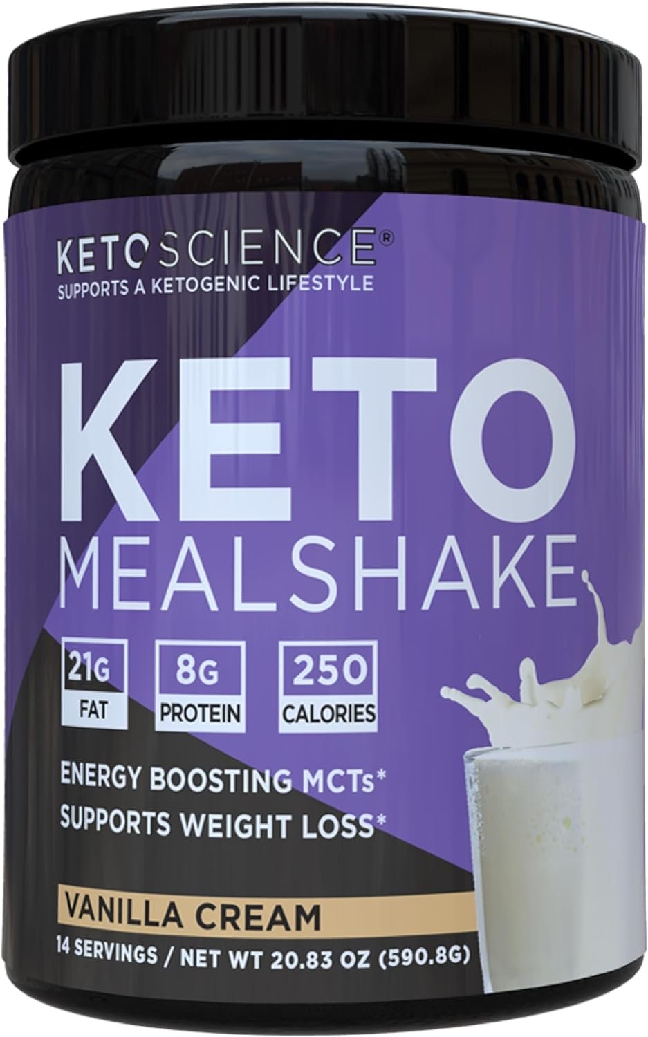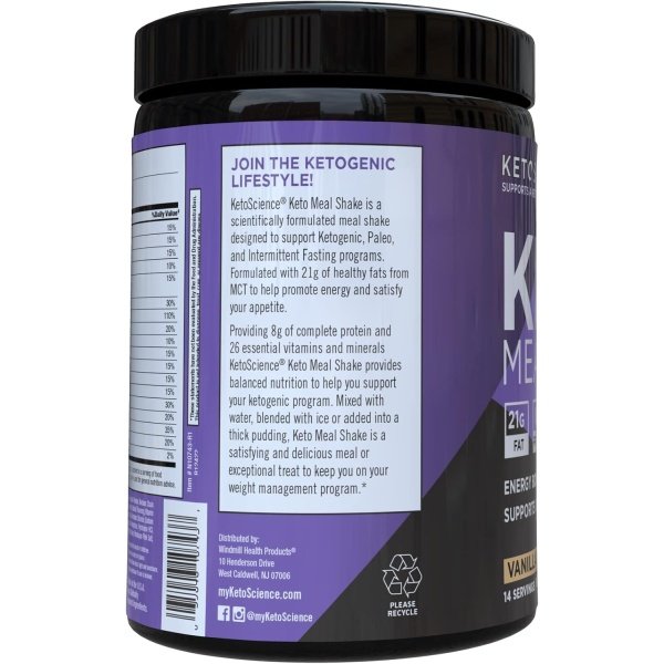 21 g fat. 8 g protein. 250 calories. Supports a ketogenic lifestyle. Energy boosting MCTs. Supports weight loss. 14 servings. Join the ketogenic lifestyle! KetoScience Keto Meal Shake is a scientifically formulated meal shake designed to support ketogenic, paleo and intermittent fasting programs. Formulated with 21 g of healthy fats from MCT to help promote energy and satisfy your appetite. Providing 8 g of complete protein and 26 essential vitamins and minerals KetoScience Keto Meal Shake provides balanced nutrition to help you support your ketogenic program. Mixed with water, blended with ice or added into a thick pudding, Keto Meal Shake is a satisfying and delicious meal or exceptional treat to keep you on your weight management program. Sold by weight, not by volume. Settling may occur. myKetoScience.com. www.canyonplastics.com. Facebook. Instagram. (at)myKetoScience. Please recycle. (These statements have not been evaluated by the Food and Drug Administration. This product is not intended to diagnose, treat, cure, or prevent any disease.) Made in the USA from globally sourced ingredients.