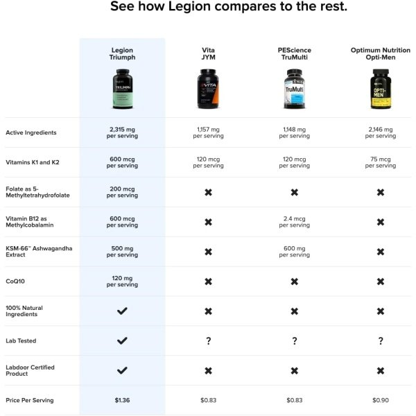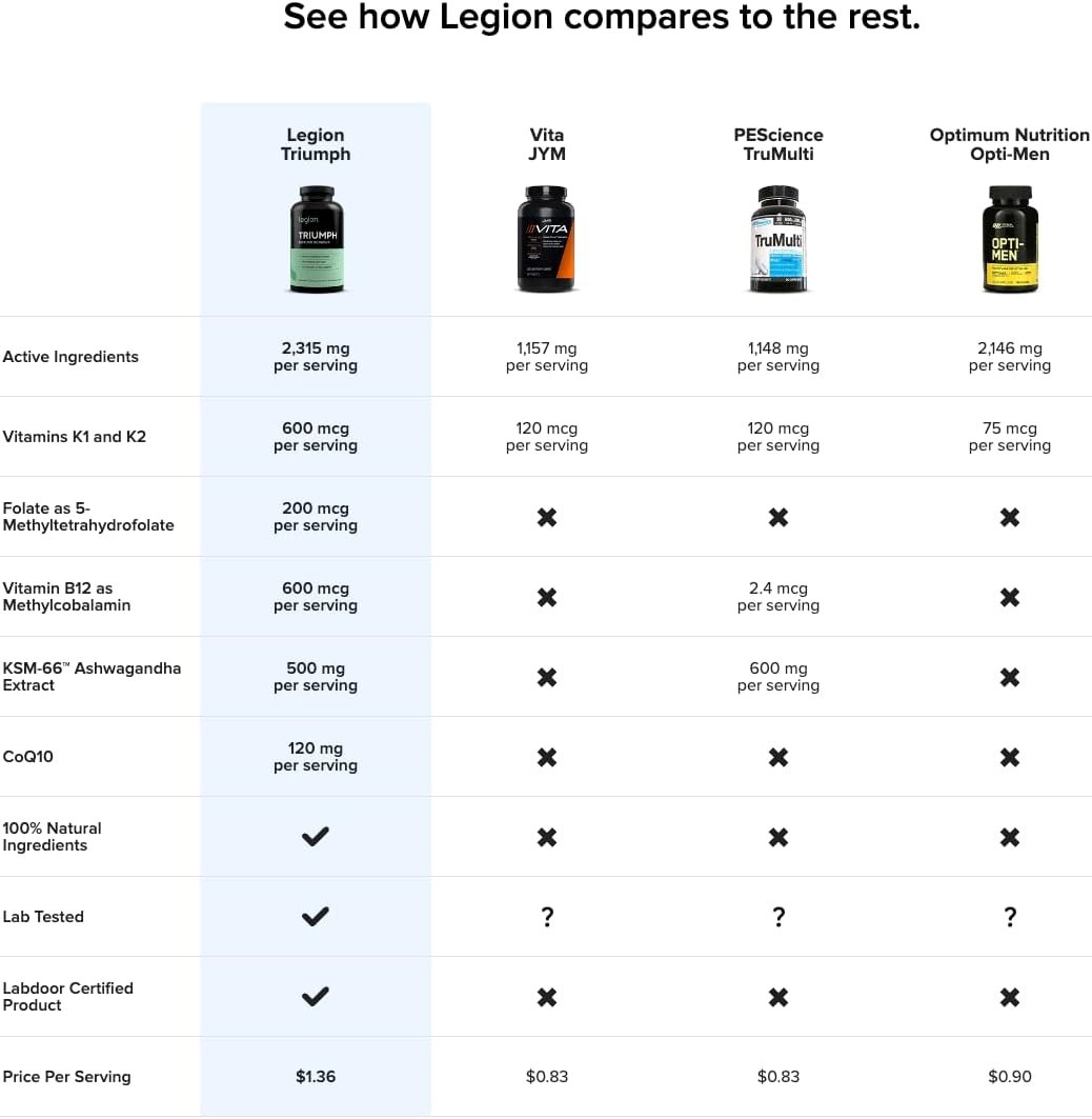 It contains 5 ingredients scientifically proven to improve physical performance and recovery, which means better workouts for you.Boost your mind and mood.Triumph contains 4 ingredients scientifically proven to improve cognition, memory, and mood. An energy multivitamin that you can feel.We hear from customers every day that love the clean energy boost they get from Triumph.Buy the best multivitamin for men and women with confidence.Legion Athletics manufactures its products in the USA in a CGMP- and NSF-certified facility.