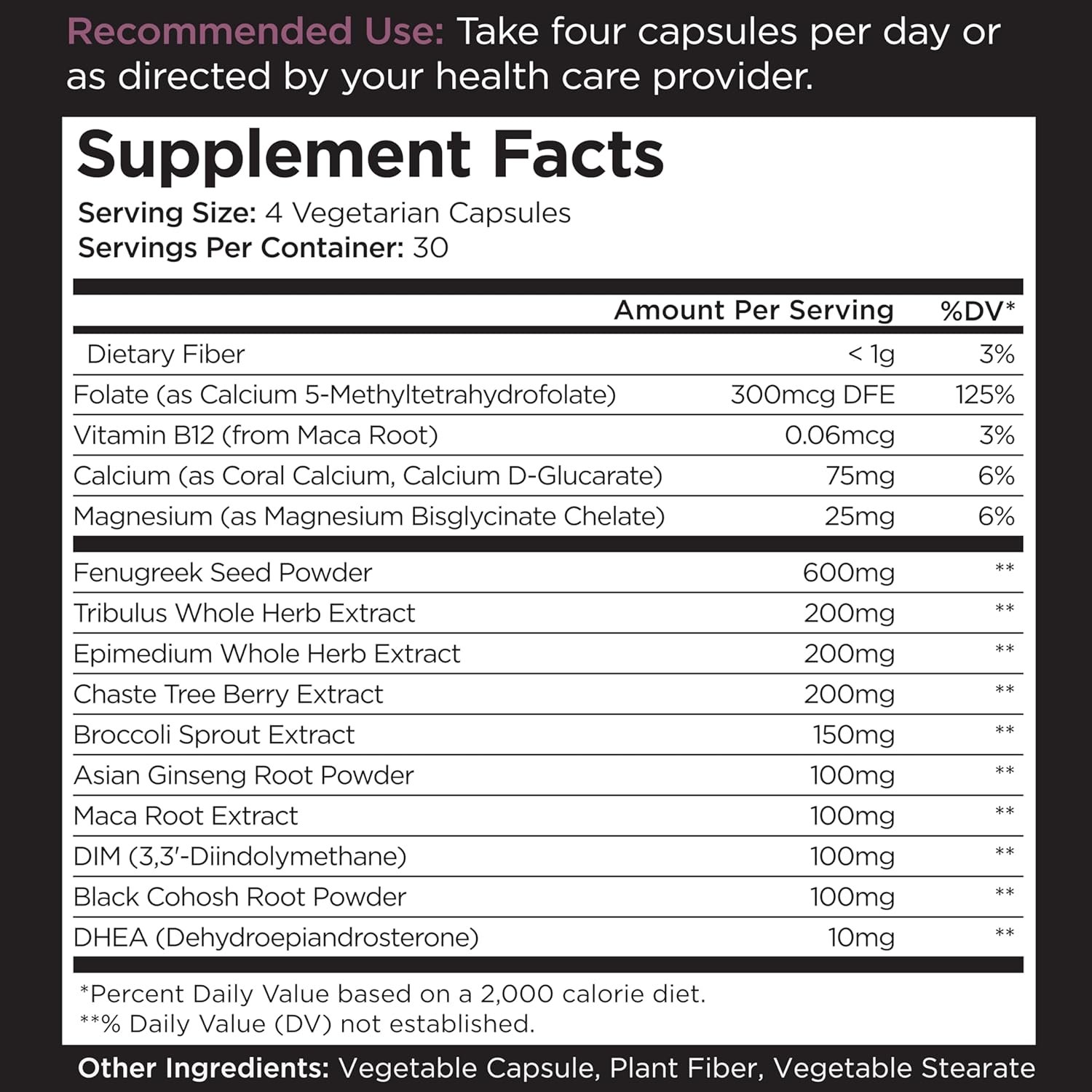 Folate (as Calcium 5-Methyltetrahydrofolate), Vitamin B12 (from Maca Root), Calcium (as Coral Calcium, Calcium D-Glucarate), Magnesium (as Magnesium Bisglycinate Chelate), Fenugreek Seed Powder, Tribulus Whole Herb Extract, Epimedium Whole Herb Extract, Chaste Tree Berry Extract, Broccoli Sprout Extract, Asian Ginseng Root Powder, Maca Root Extract, DIM (3,3’ Diindolylmethane), Black Cohosh Root Powder, DHEA (Dehydroepiandrosterone) — 𝗢𝘁𝗵𝗲𝗿 𝗜𝗻𝗴𝗿𝗲𝗱𝗶𝗲𝗻𝘁𝘀: Vegetable Capsule, Plant Fiber, Vegetable Stearate