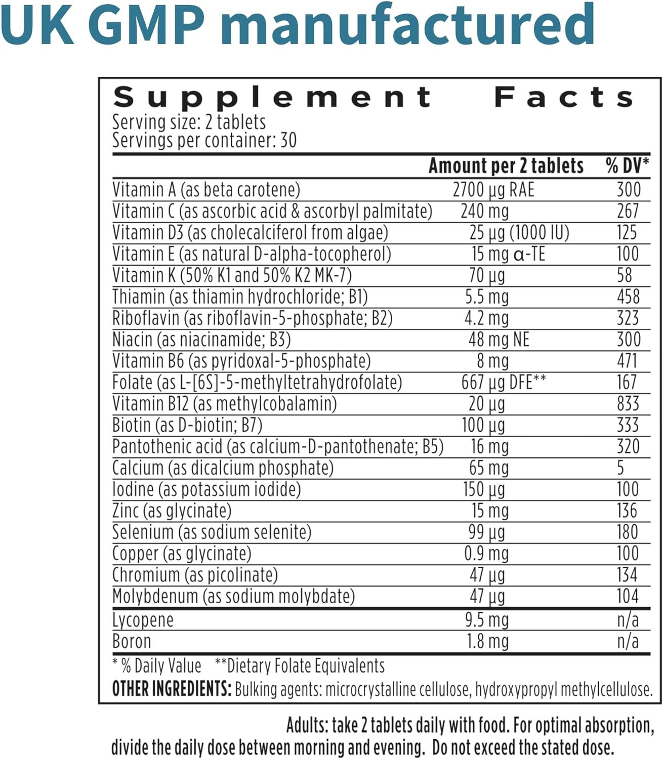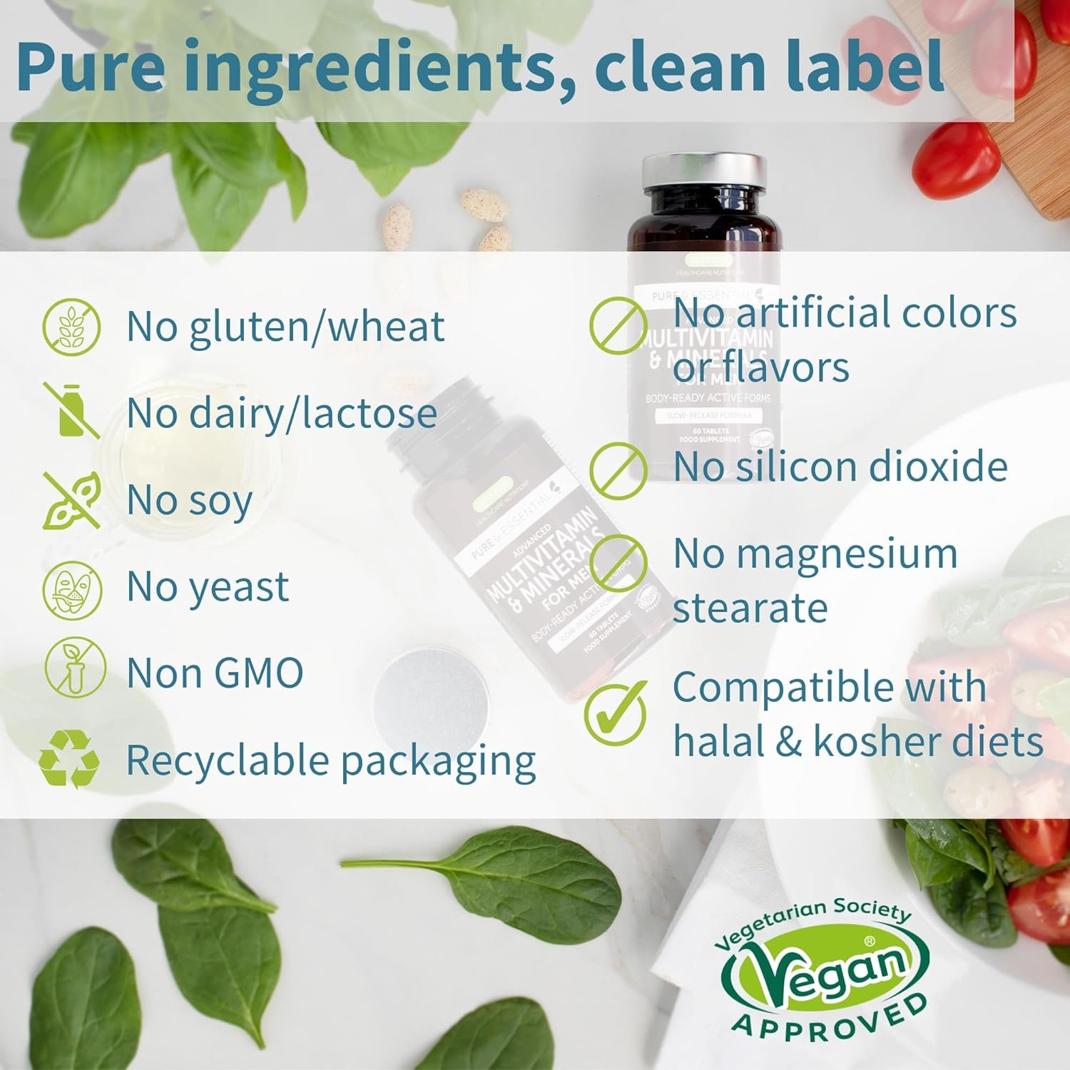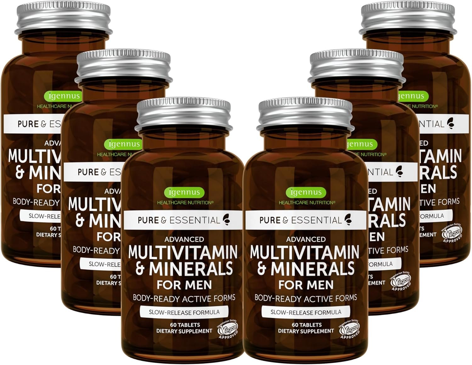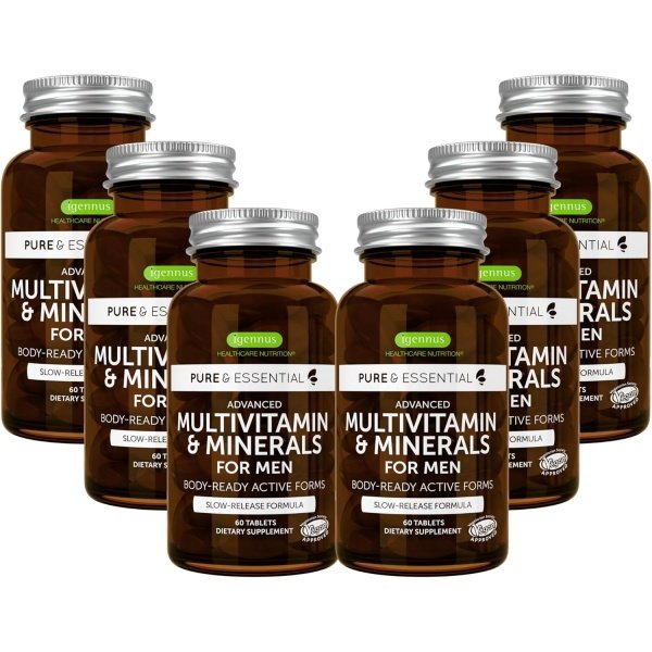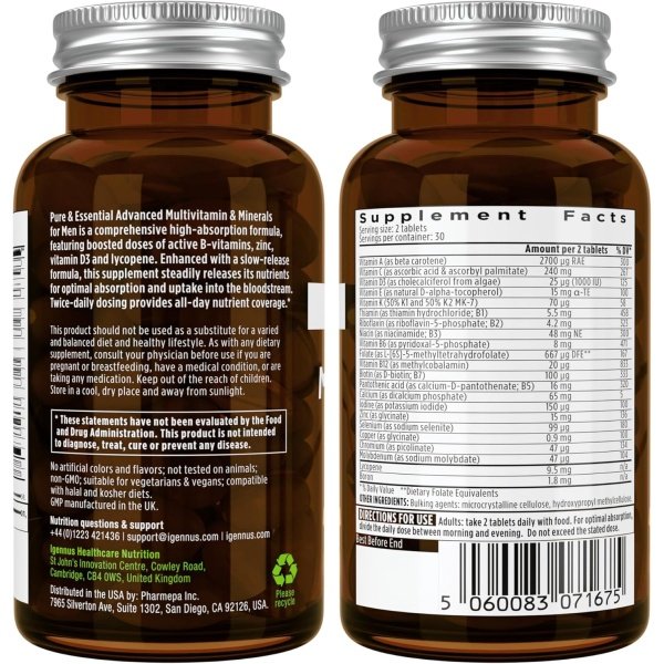 Pure & Essential Advanced Multivitamin and Minerals for Men is a high-absorption multi-nutrient supplement without iron formulated to provide comprehensive nutritional support for adult men of all ages. This vegan formula features highly bioavailable and active forms, allowing nutrient levels to be effectively raised in the body for superior benefits. Enhanced with sustained release technology and combined with twice-daily dosing, this supplement steadily releases nutrients into the bloodstream for all-day nutrient coverage. Expertly formulated by Igennus nutrition scientists with effective doses and balanced nutrient ratios, this supplement works in harmony with the body. It complements and tops up the diet, so it is safe to take long term. Designed to support overall physical and mental wellbeing, we have elevated doses of vitamin D, B6 & B12 and zinc, plus 10mg lycopene for enhanced coverage for energy and endurance, immunity, male hormonal balance, brain function and mood, muscle function, cardiovascular and prostate health.