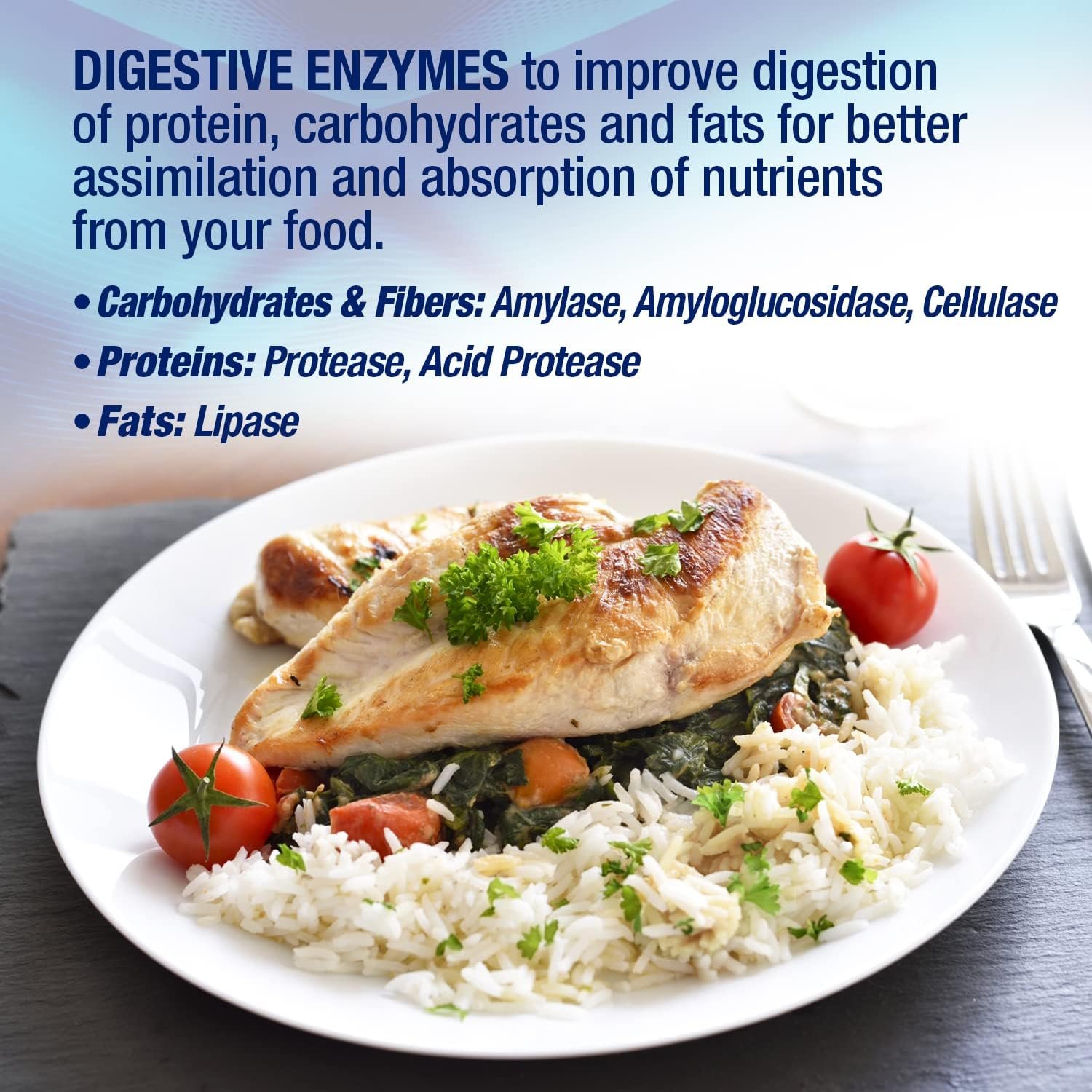 Aid Digestion – The comprehensive digestive enzyme blend supports protein, carbohydrate, and fat digestion and absorption.