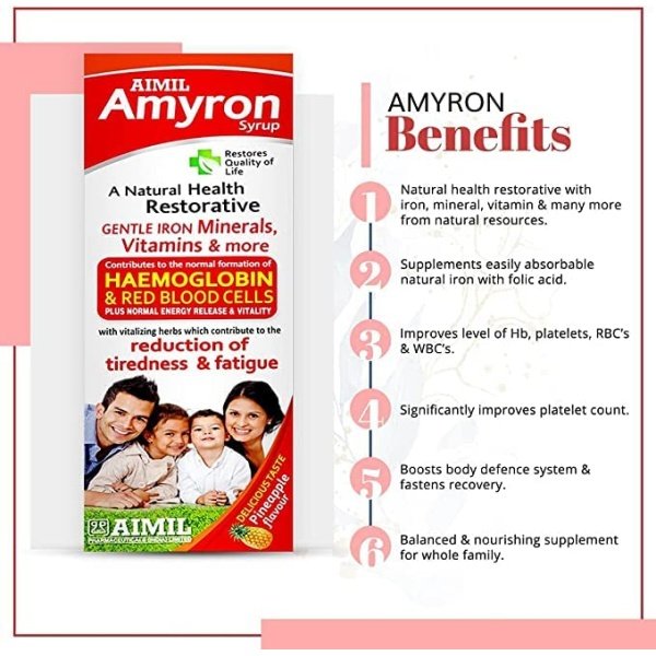 Amyron is a special formula for all ages with vitalizing herbs which contributes to reduction of tiredness & fatigue. Amyron supplements natural iron which helps improve haemoglobin level. Instructions: Adults (Men & Women): 3 Teaspoonful twice a day. Children: (1-3 years): 1/2 Teaspoonful twice a day. (4-6 years): 1 Teaspoonful twice a day. (7-12 years): 2 Teaspoonful twice a day. or as directed by the physician.