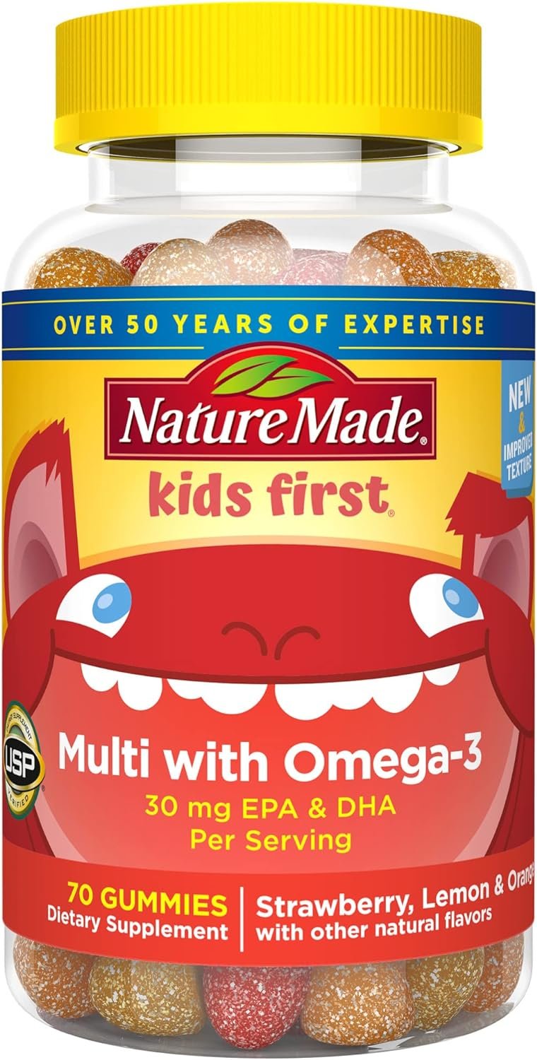 Nutritional support supplement: contains one 70 count bottle of Nature Made Kids First Multivitamin with Omega-3 Gummies, 30 mg EPA and DHA
