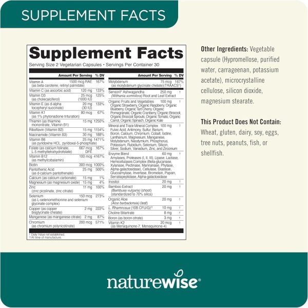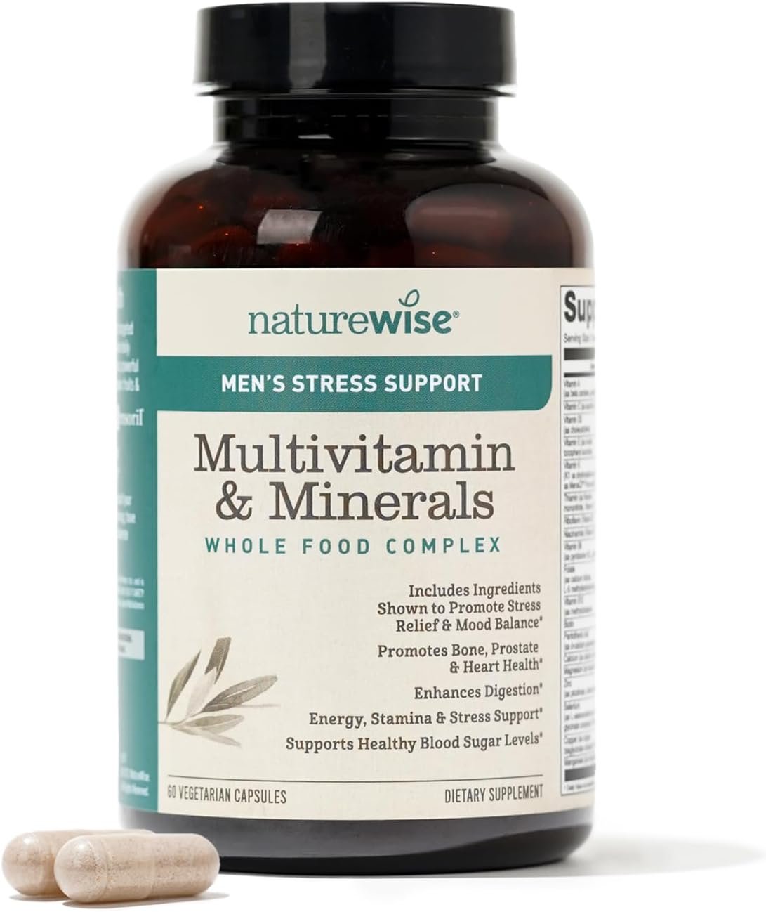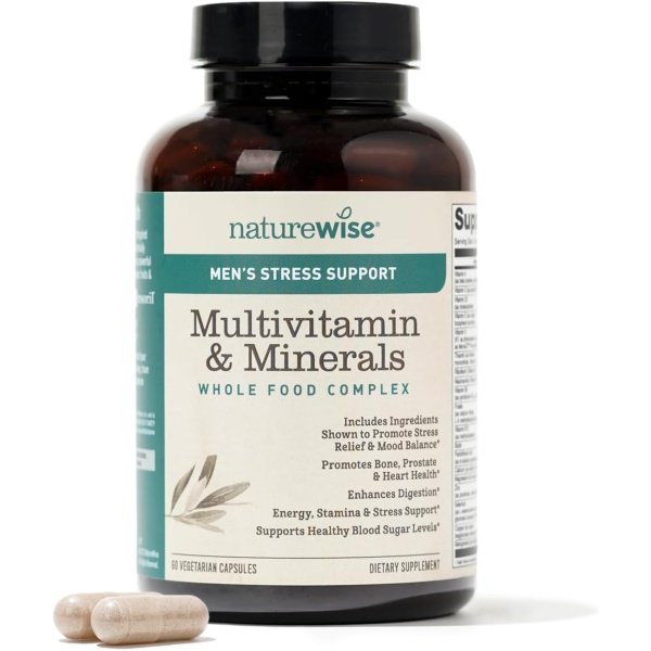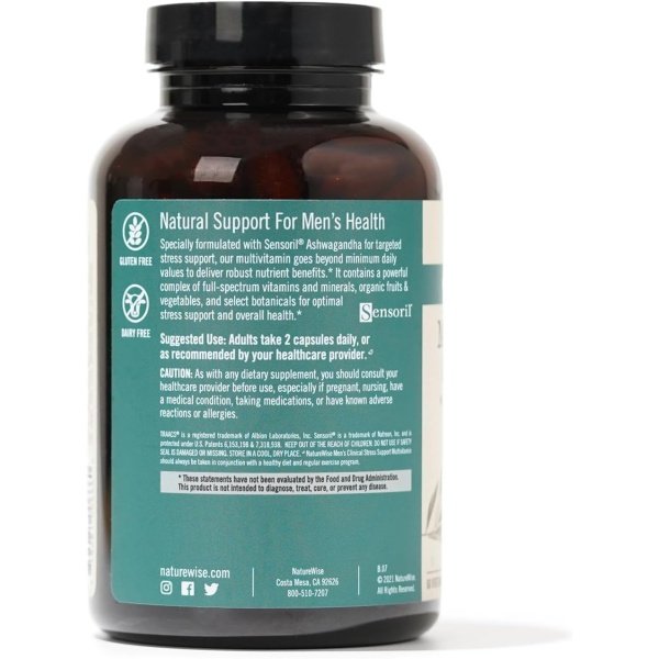 Men’s Multivitamin with Stress Support provides comprehensive support for men’s health. This unique whole food complex multivitamin addresses key aspects of men’s health with 22 vitamins and minerals to support heart and immune health.* Rich with fulvic ionic minerals and trace minerals, NatureWise Men’s Multivitamin meets the nutritional needs of men to help them feel their very best.* Among the 22 vitamins and minerals in this formula are vitamin A, C, D3, E, K2, B-complex, calcium, magnesium, zinc, and more. This multivitamin for men also contains organic fruits and vegetables, such as strawberry, blueberry, raspberry, kale, and broccoli. This vitamin is enhanced with digestive enzymes that specifically target the digestion of starches, protein, fats, and fiber to promote better absorption of the vitamin.* Men’s Multivitamin is formulated with a comprehensive fulvic acid complex that may enhance your overall well-being, immune function, and brain function.* On top of its robust vitamin complex, Men’s Multivitamin is designed for stress support with its dose of Sensoril® Ashwagandha, which may support a healthier stress response and promote relaxation.* Support your daily health and your body’s stress responses with NatureWise Men’s Multivitamin with Stress Support. This product is vegetarian, gluten free, and does not contain wheat, eggs, soy, dairy, tree nuts, peanuts, fish, or shellfish.