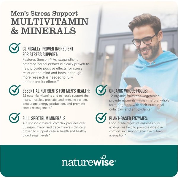 STRESS SUPPORT: NatureWise Men’s Multivitamin features Sensoril Ashwagandha, a potent herbal extract that’s been studied for its potential to support your body’s stress response.*