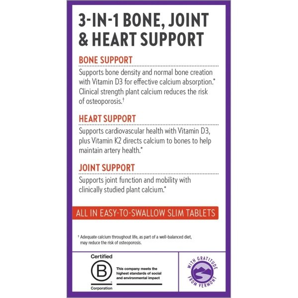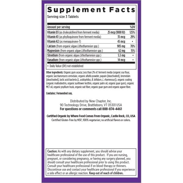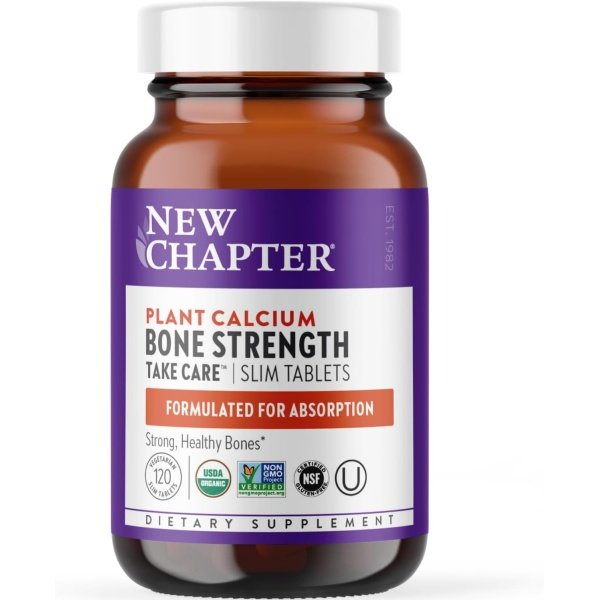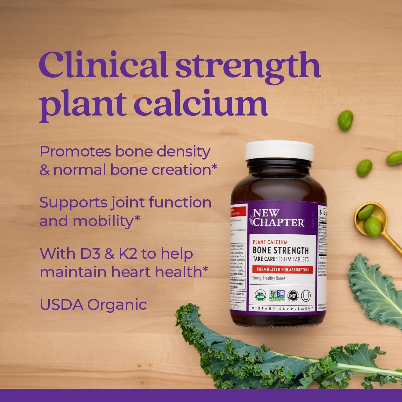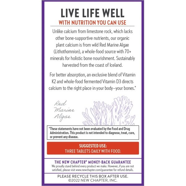 Did you know that most calcium carbonate supplements come from limestone rock and lack other bone-supportive nutrients? Our organic plant calcium is different! Bone Strength Take Care™ is sourced from Red Marine Algae, a whole-food source that’s rich in Calcium plus Magnesium and 70+ trace minerals. No limestone rock! For your best absorbed calcium formula, we add a proprietary blend of Vitamin K2 and fermented D3 that directs calcium right to your bones where you need it, which also helps to maintain artery health.* Experience the magic inside clinical-strength organic plant calcium for 3-in-1 benefits: strong bones, flexible joints, and heart health.* Here at New Chapter®, we sustainably source the highest quality ingredients and craft with you and our planet in mind. We do all this, so you can do you! That’s wellness, well done. *These statements have not been evaluated by the Food and Drug Administration. This product is not intended to diagnose, treat, cure, or prevent any disease.