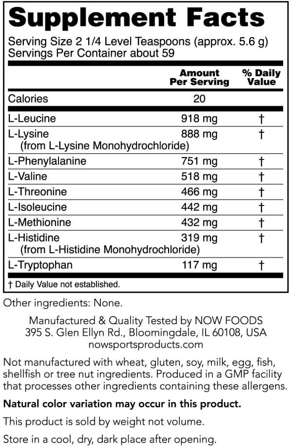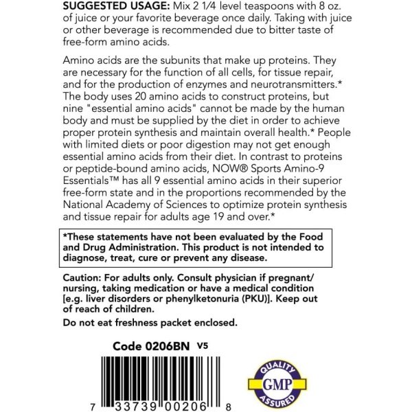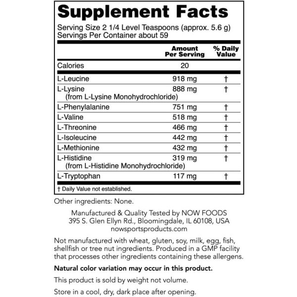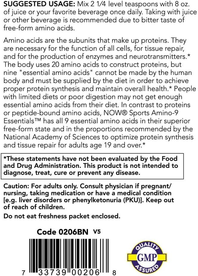 In contrast to proteins or peptide-bound amino acids, NOW® Sports Amino-9 Essentials™ has all 9 essential amino acids in their superior free-form state and in the proportions recommended by the National Academy of Sciences to optimize protein synthesis and tissue repair for adults age 19 and over.* Amino acids are the subunits that make up proteins. They are necessary for the function of all cells, for tissue repair, and for the production of enzymes and neurotransmitters.* The body uses 20 amino acids to construct proteins, but nine “essential amino acids” cannot be made by the human body and must be supplied by the diet in order to achieve proper protein synthesis and maintain overall health.* People with limited diets or poor digestion may not get enough essential amino acids from their diet. Natural color variation may occur in this product.
