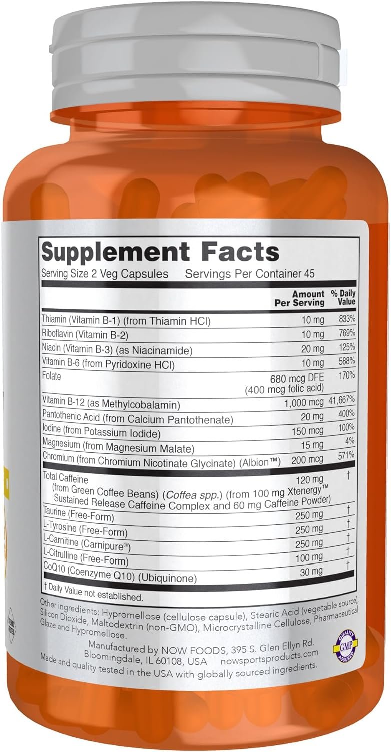 Mental Alertness* Sustained Release Caffeine With B Vitamins NOW® Sports Sustained Energy is formulated to supply the nutrients you need to promote sustained energy production and mental alertness.* With a complement of B vitamins and other cofactors such as chromium, magnesium malate and carnitine, Sustained Energy delivers what your cells need most to drive energy production.* This product also has tyrosine and iodine to support optimal thyroid function, plus a blend of immediate and sustained release caffeine to get you going and keep you going.* This product has approx. 120 mg of immediate and sustained release caffeine per serving (equivalent to about 1 1/4 cups of coffee).