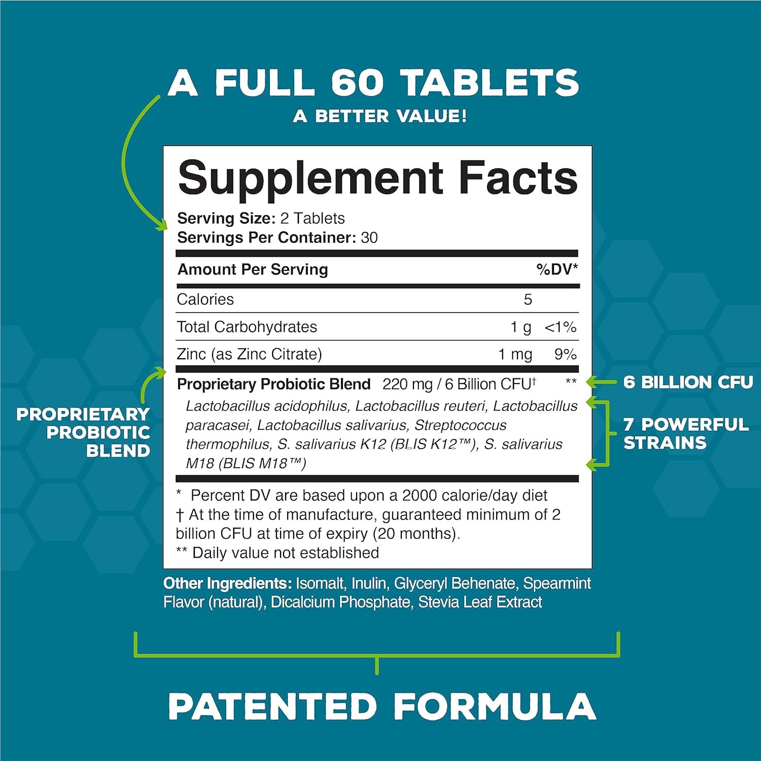 Clinically Researched Strains — A powerful blend of dental probiotics packed with 7 potent strains of probiotics: the patented BLIS K12 and BLIS M18, Lactobacillus Acidophilus, Lactobacillus Reuteri, Lactobacillus Salivarius, Lactobacillus Paracasei, Lactobacillus Thermophilus, and Streptococcus Salivarius.