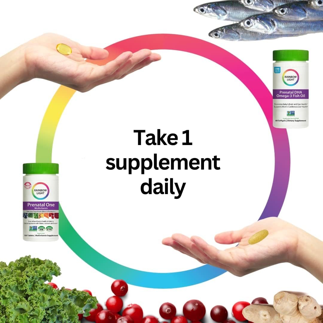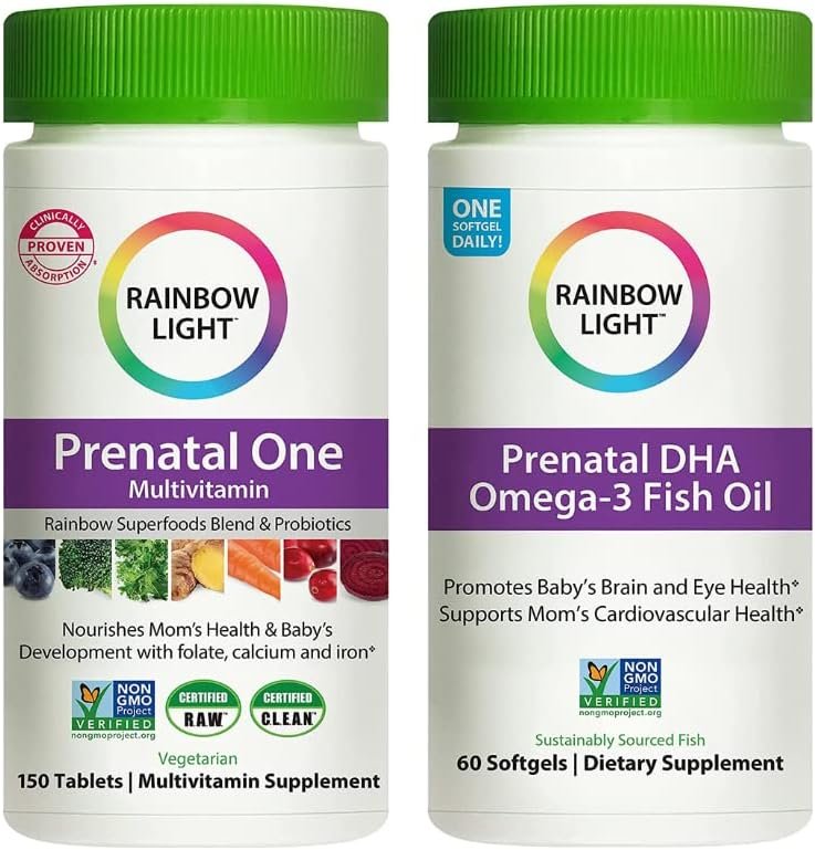 Nourish your body and support your growing baby by taking prenatal vitamins of each of Rainbow Light Prenatal Vitamins Bundle. This comprehensive bundle is specially paired for expectant mothers and provides a balanced blend of essential nutrients to support a healthy pregnancy. Rainbow Light Prenatal One Multivitamins: These tablets are specifically formulated to meet the unique nutritional needs of pregnant women. They contain a blend of vitamins, minerals, and herbs, including Folate, Iron, and Ginger, to support healthy growth and development of the baby, as well as energy and overall wellness for the mother. Rainbow Light Prenatal DHA Omega-3 Fish Oil Softgels: These soft gels contain essential omega-3 fatty acids, including DHA, which are important for the healthy development of the baby’s brain and eyes. They are also beneficial for the mother’s emotional and cognitive health.