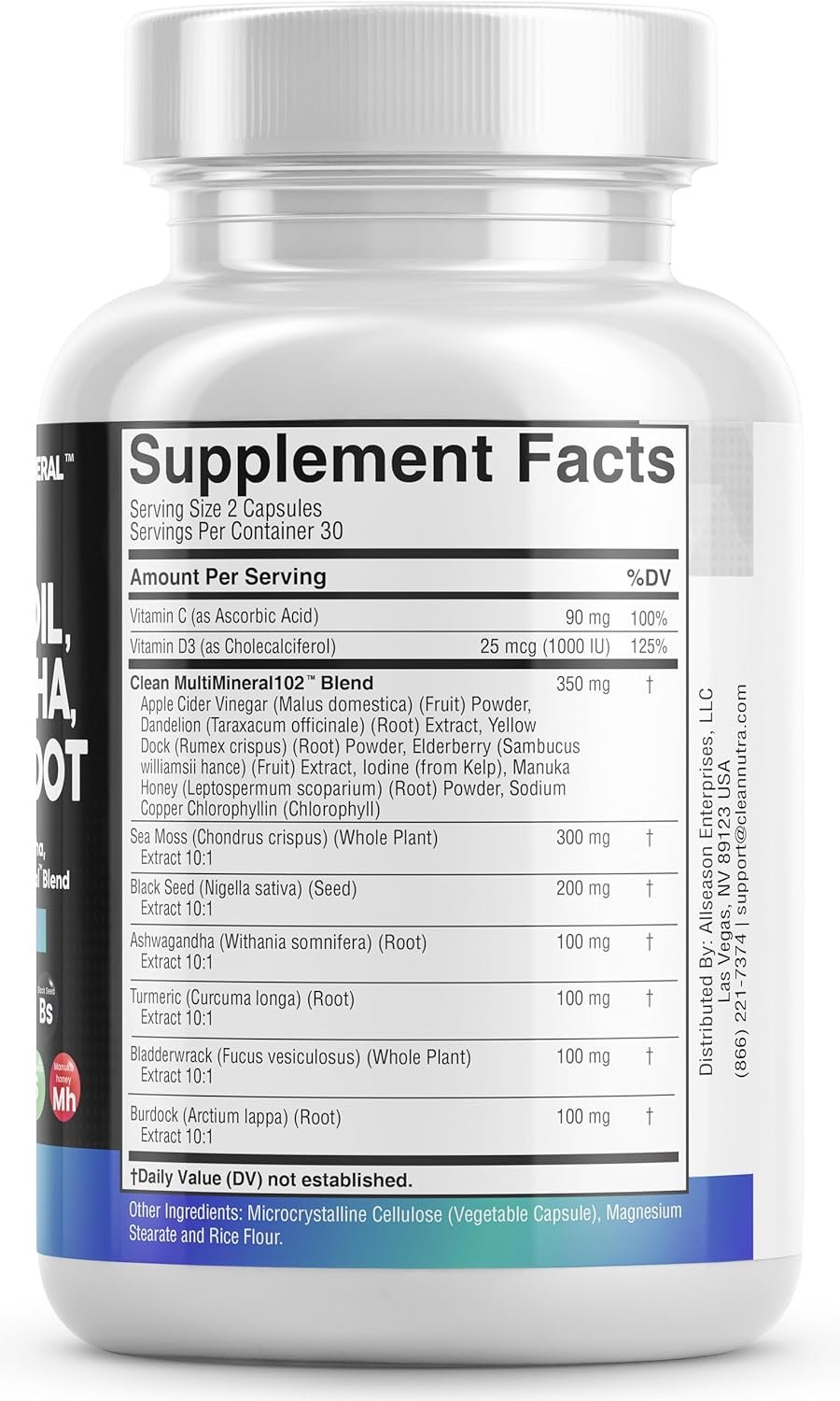 A Powerful All In One Supplement – Clean MultiMineral is overflowing with potent Sea Moss Supplement, Black Seed Oil capsules, Aswagandhada capsules, Burdock Root, Bladderwrack and turmeric powder. Clear out those countless supplements in your supplement cabinet, and replace it with just one seamoss powder, black seeds oil, aswagandhada capsules, and burdock supplement 15-in-1 formula from Clean Nutraceuticals. We made Irish seamoss bladderwrack burdock capsules better by adding black seed.