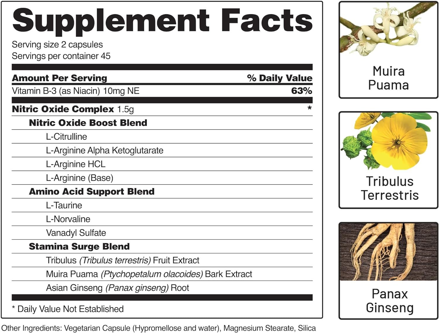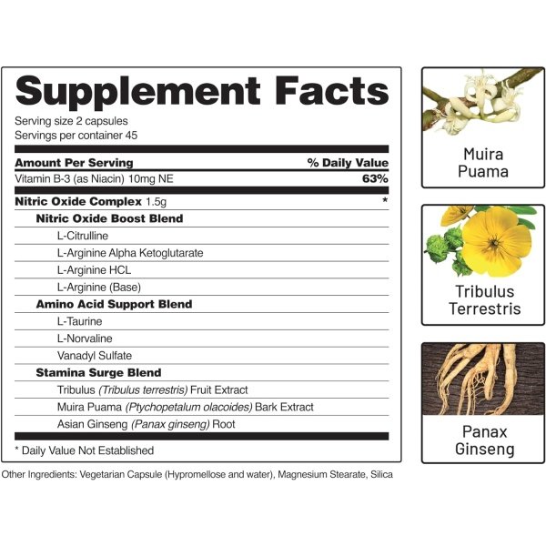 L-Citrulline, L-Arginine HCL, L-Arginine Alpha Ketoglutarate, L-Taurine, L-Norvaline, Vanadyl Sulfate, Tribulus Fruit Extract, Muira Puama Bark Extract, Asian Ginseng Root