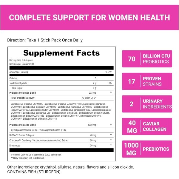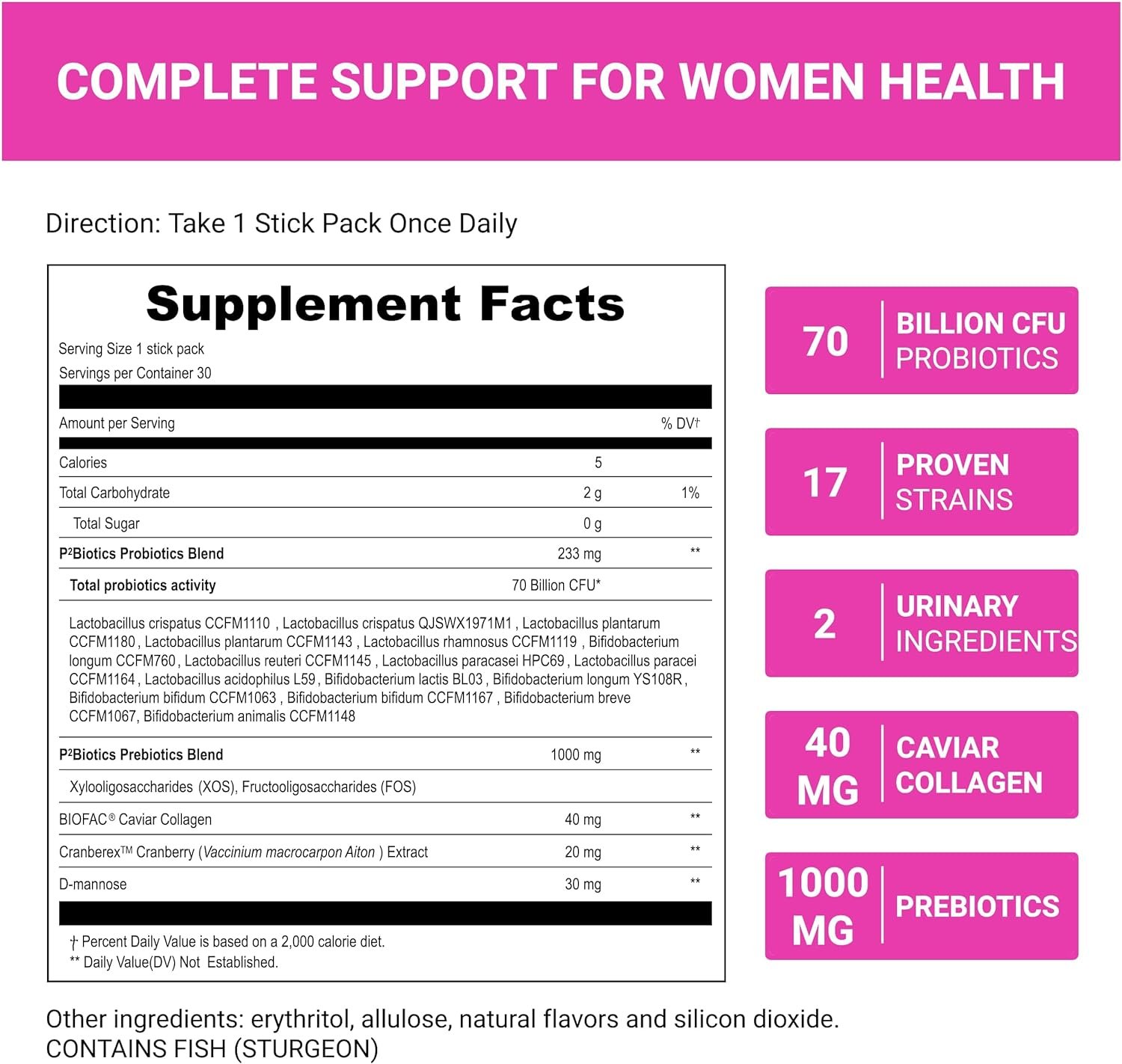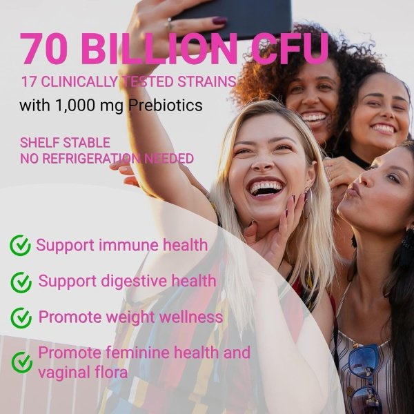 COMPLETE PROBIOTIC SUPPORT: Our women’s supplement provides 70 Billion CFU and 17 probiotic strains, along with caviar collagen peptides, prebiotic fiber, cranberry mannose. It’s a comprehensive solution for digestive, immune, feminine, skin, joint, and weight wellness.