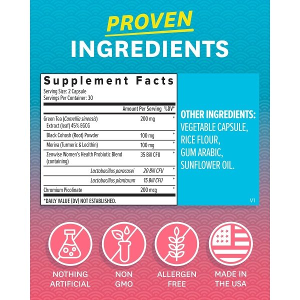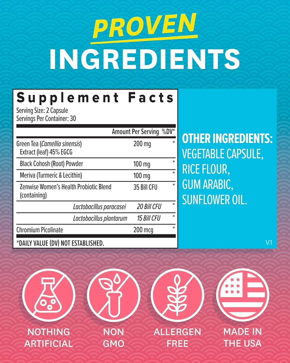 Green Tea (Camellia sinensis) Extract (leaf) 45% EGCG, Black Cohosh (Root) Powder ,Meriva (Turmeric & Lecithin) , Zenwise Women’s Health Probiotic Blend (containing), Lactobacillus paracasei ,Lactobacillus plantarum ,Chromium Picolinate, Rice Flour, Vegetable Capsule (HPMC)