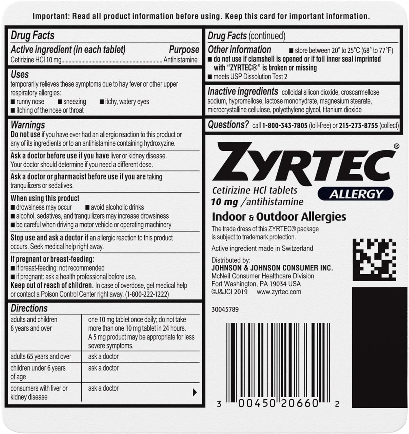 Get 24-hour relief from allergy symptoms caused by ragweed, tree pollen, dust mites, pet dander hay fever and other upper respiratory allergies with Zyrtec Allergy Relief Medicine Tablets. With 10 milligrams of the antihistamine cetirizine hydrochloride per tablet, this prescription-strength allergy relief medicine provides 24 hours of relief from common symptoms of allergies including runny nose, sneezing, itchy, watery eyes, and itching of the nose or throat. From the #1 allergist-recommended brand among OTC oral antihistamines, these all-day anti-allergy tablets effectively treat indoor allergies caused by dust, mold, and pet dander, as well as outdoor seasonal allergies from tree pollen, weeds, and grasses. Zyrtec anti-allergy tablets work fast* at hour one and provide 24 hour relief for your indoor and outdoor allergies and work twice as hard when you take it again the next day. It is suitable for those ages 6 and older. *Starts working hard at hour 1